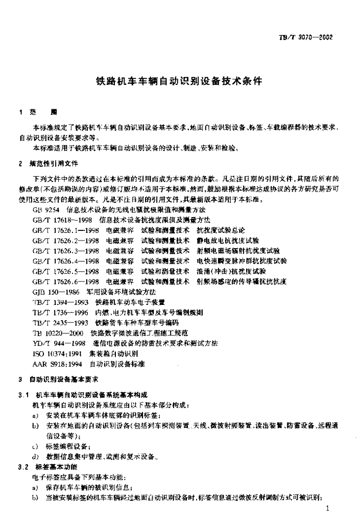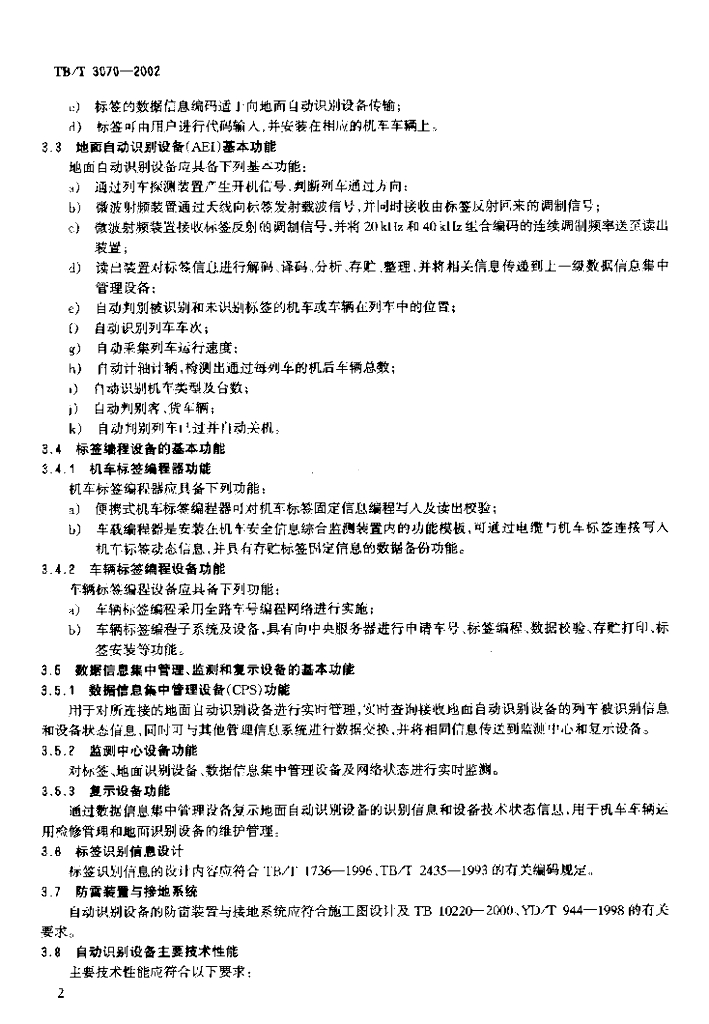 TB/T 3070-2002 铁路机车车辆自动识别设备技术条件