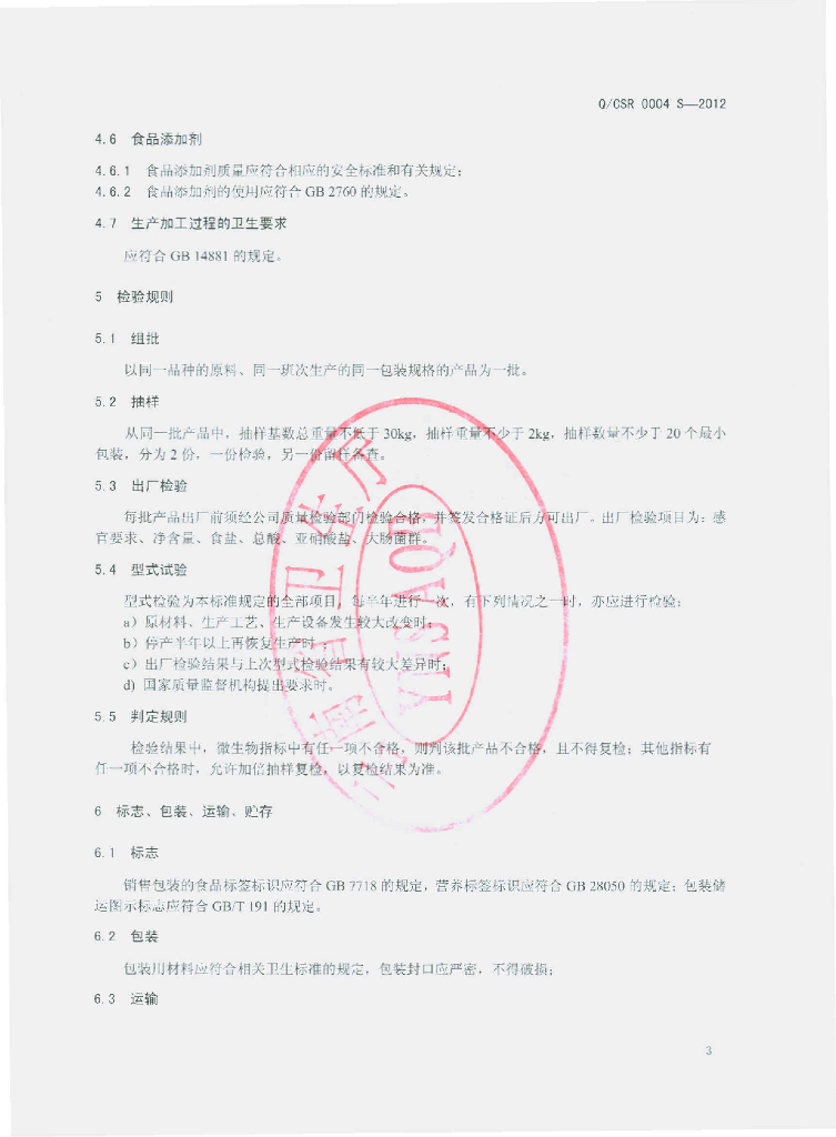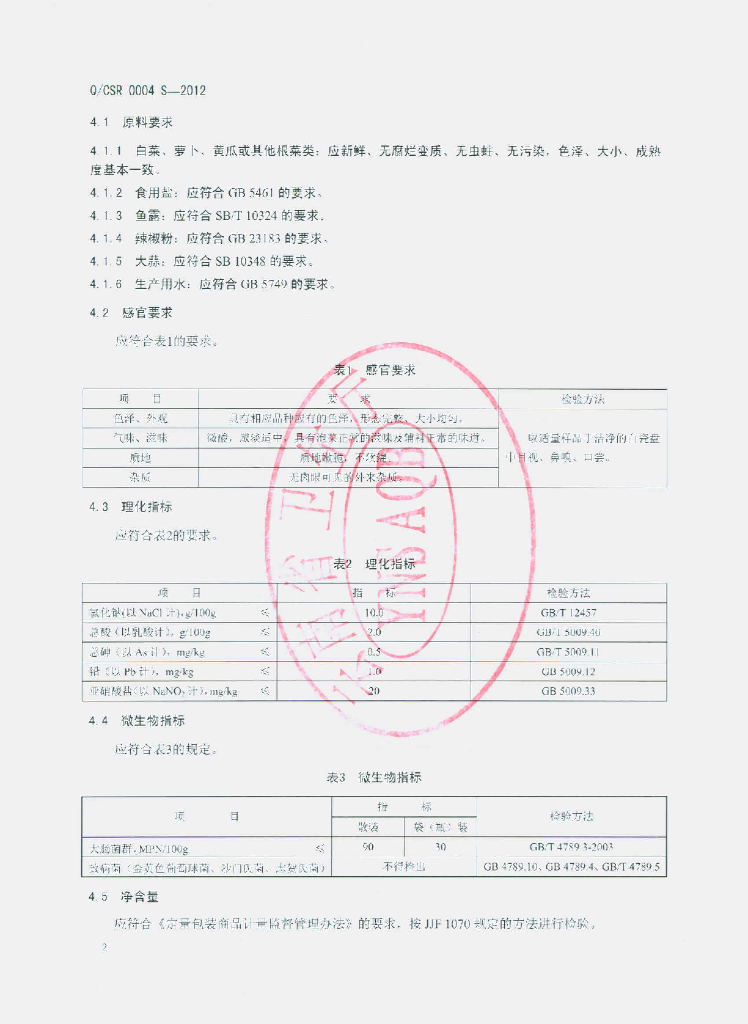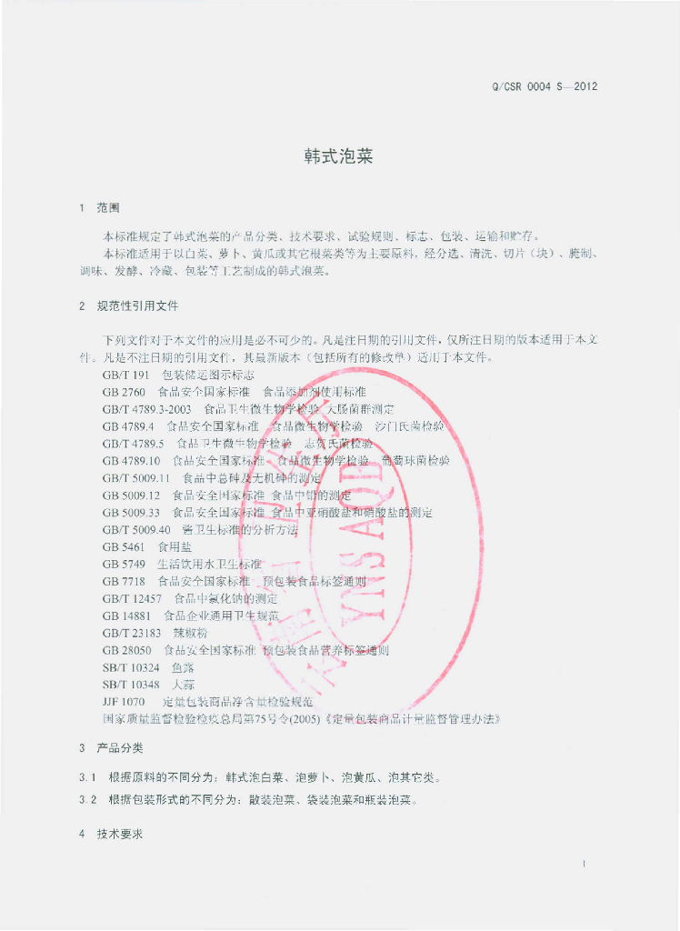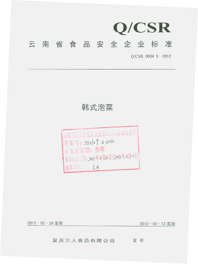 Q/CSR 0004S-2012 韩式泡菜