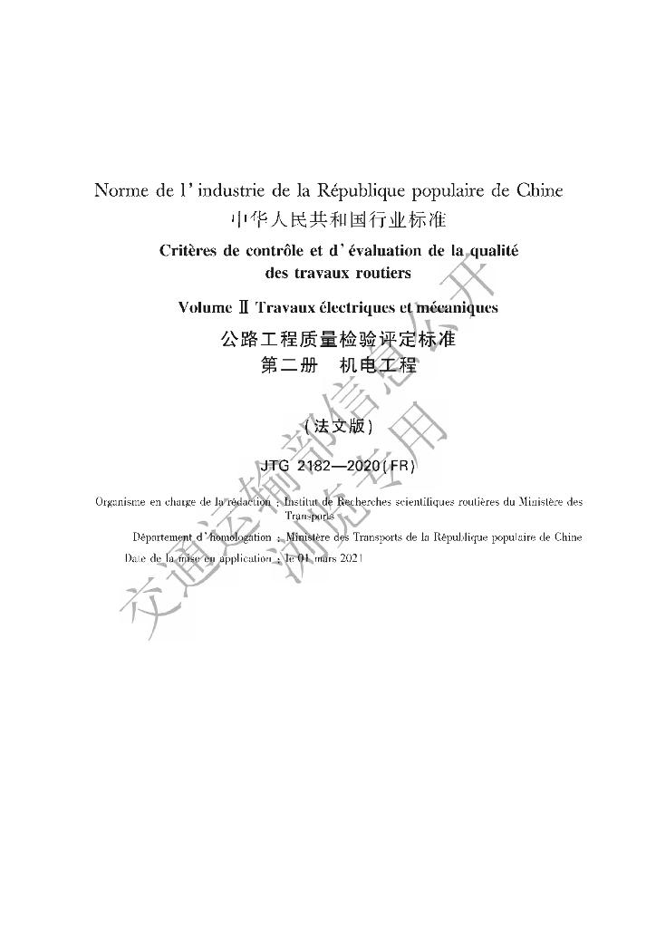 JTG 2182-2020(FR) 路工程质量检验评定标准 第二册 机电工程(法文版)