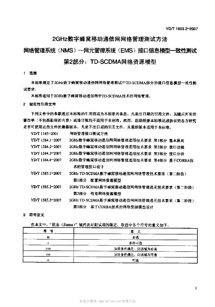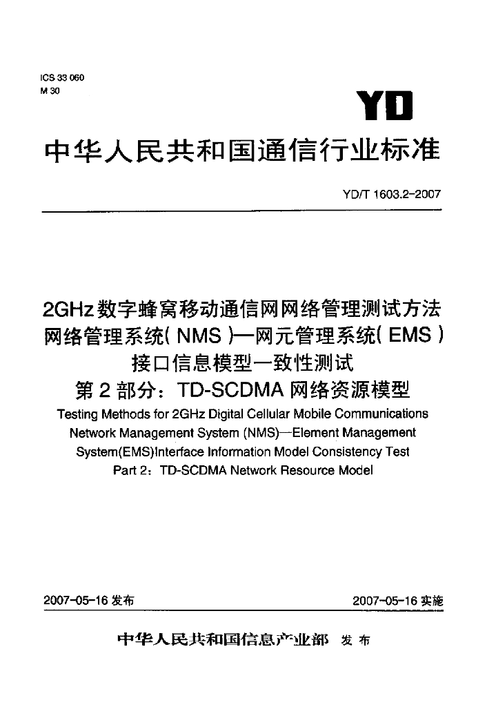 YD/T 1603.2-2007 2GHz 数字蜂窝移动通信网网络管理测试方法网络管理系统(NMS)一网元管理系统(EMS)接口信息模型一致性测试 第2部分:TD-SCDMA 网络资源模型