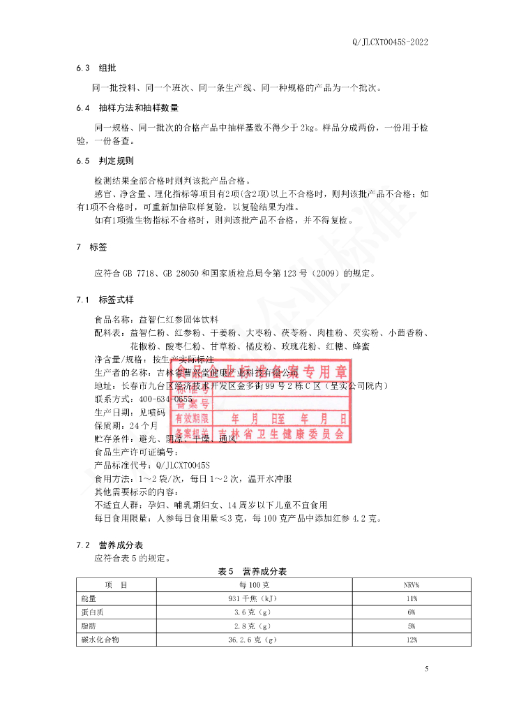 Q/JLCXT 0045S-2022 益智仁红参固体饮料