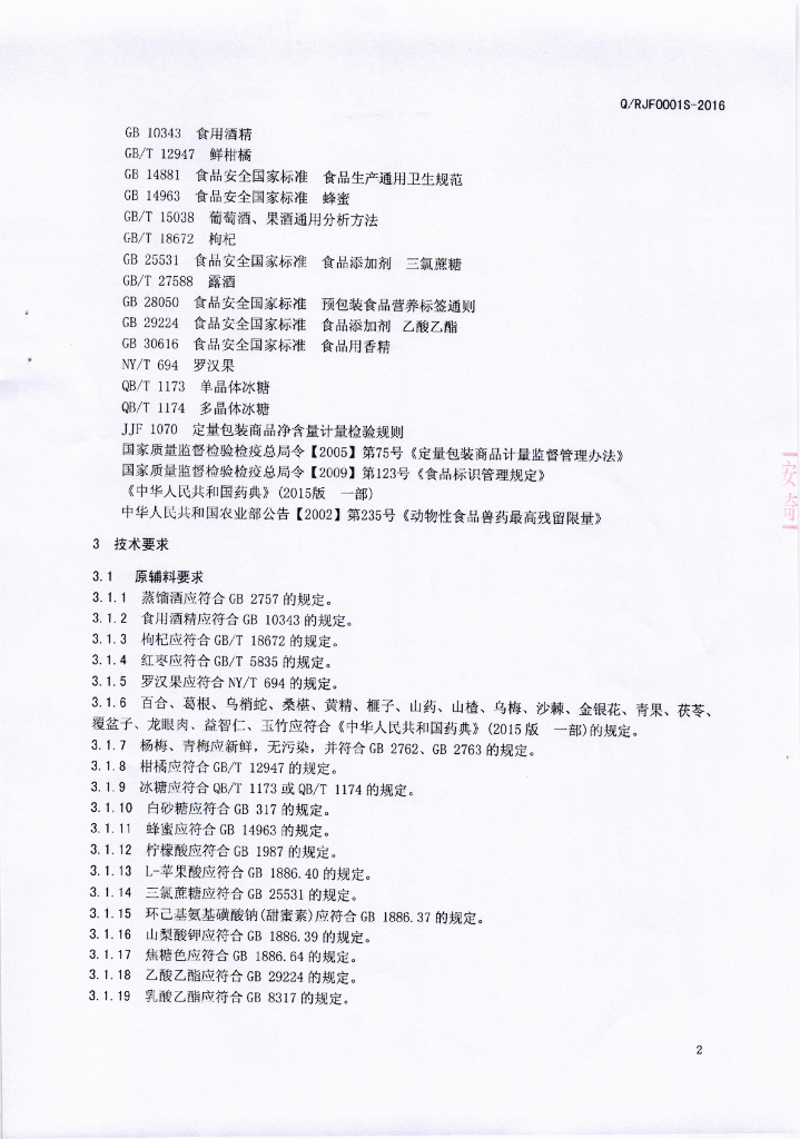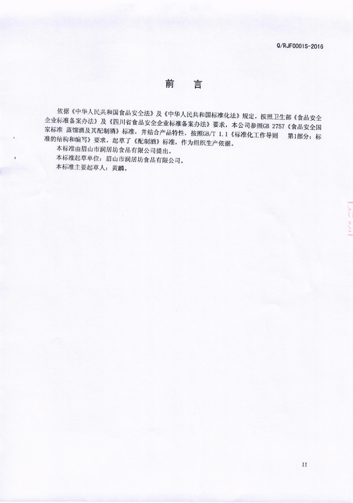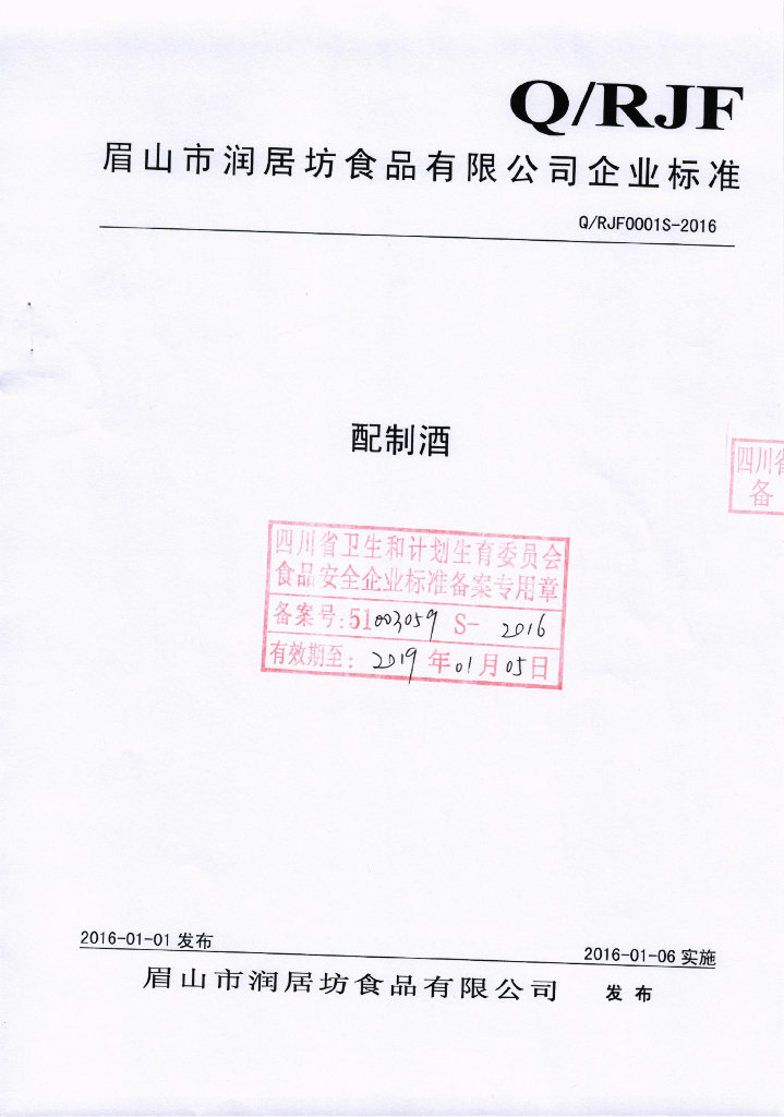 Q/RJF 0001S-2016 眉山市润居坊食品有限公司 配制酒