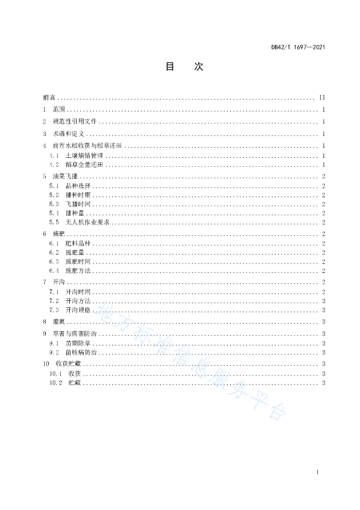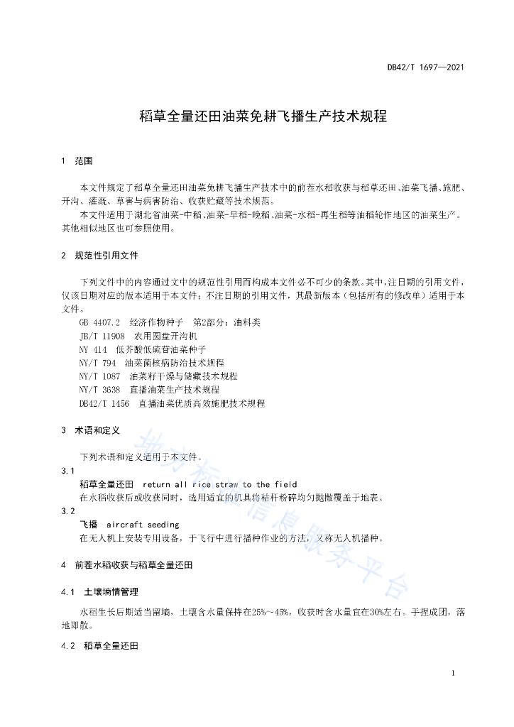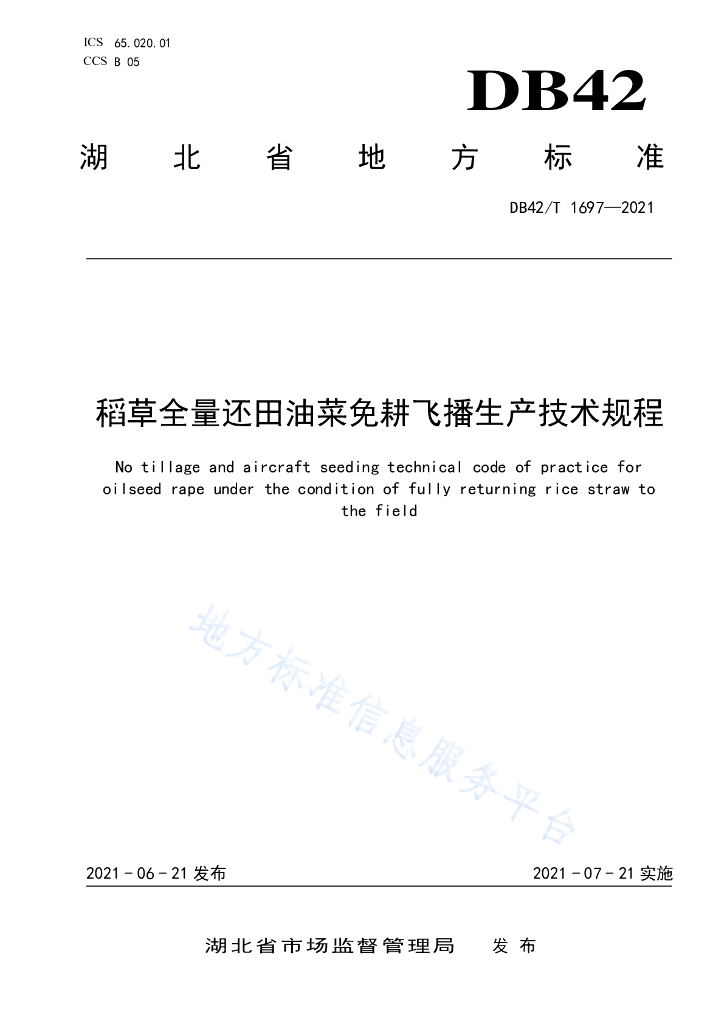DB42/T 1697-2021 稻草全量还田油菜免耕飞播生产技术规程