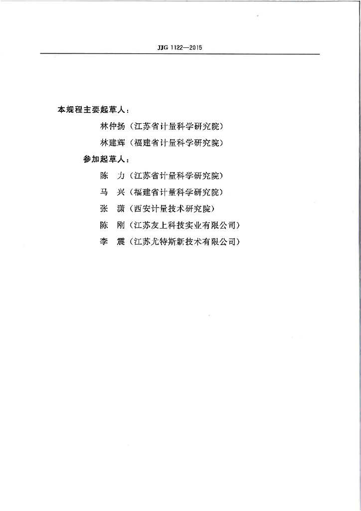 林仲扬(江苏省计量科学研究院)、林建辉(福建省计量科学研究院)、陈力(江苏省计量科学研究院)、马兴(福建省计量科学研究院)、张潇(西安计量技术研究院)、陈刚(江苏友上科技实业有限公司)、李震(江苏尤特斯新技术有限公司)