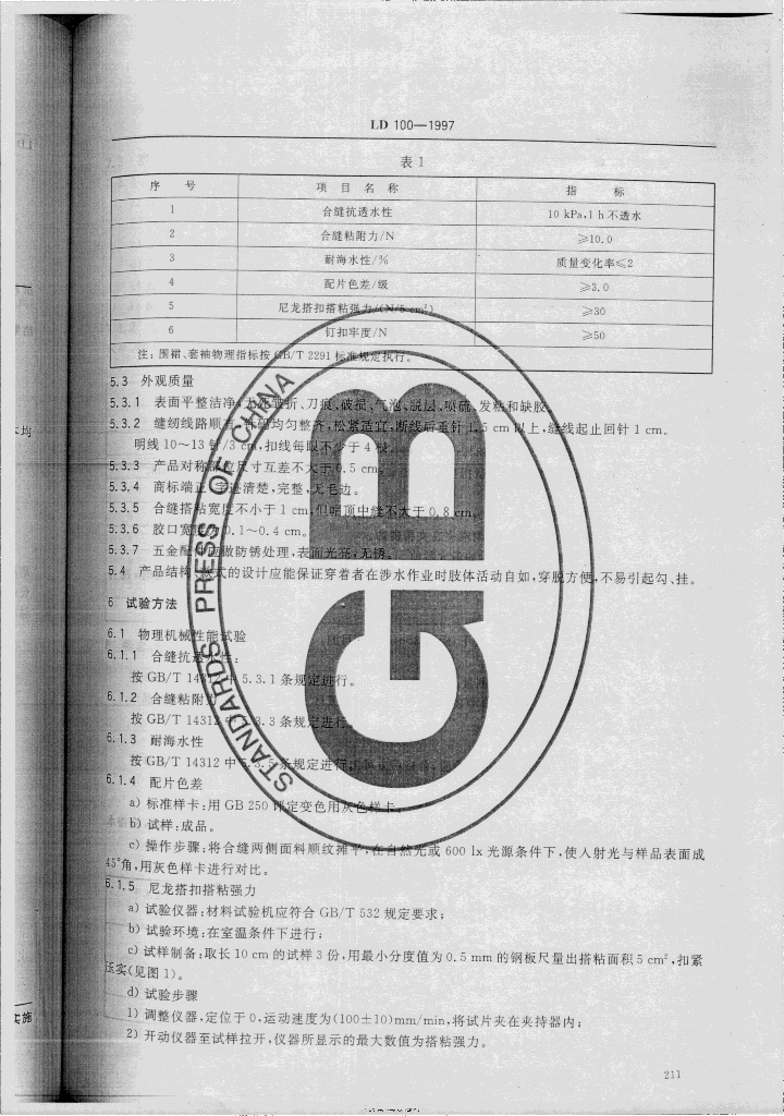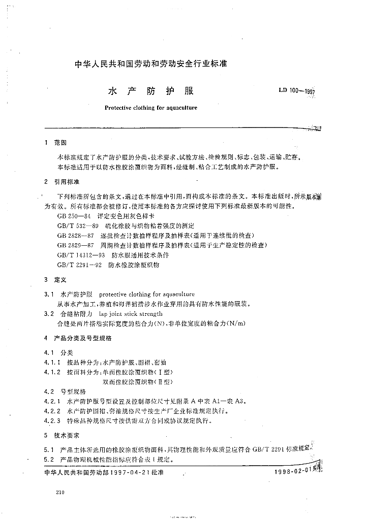 LD/T 100-1997 水产防护服