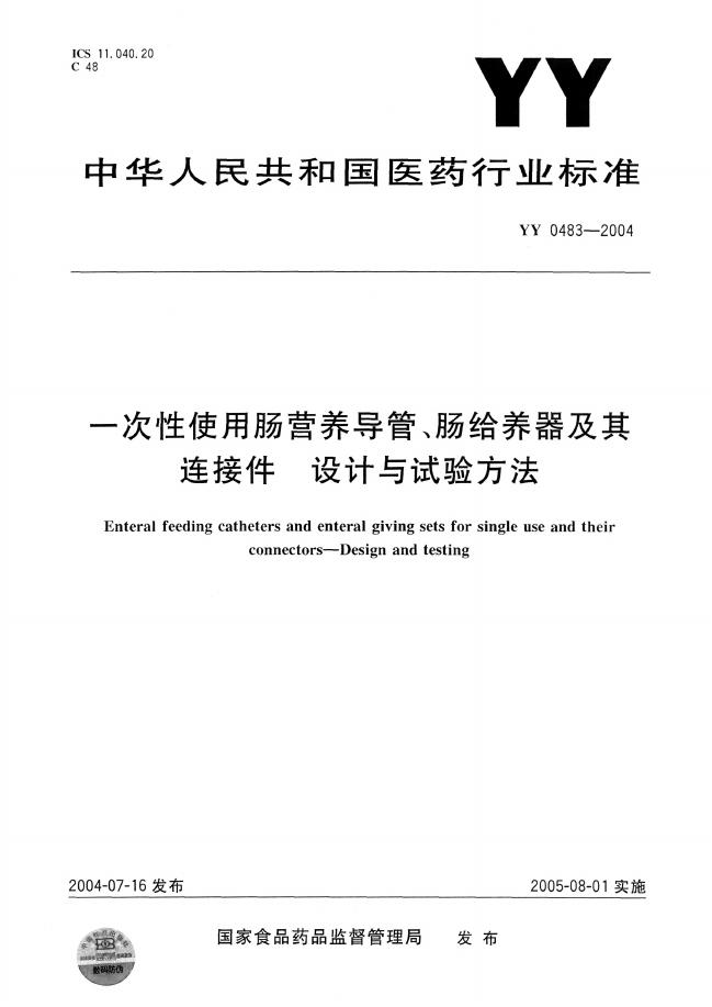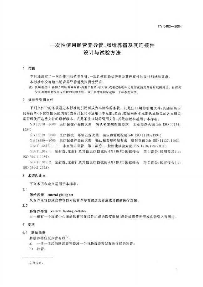 YY/T 0483-2004 一次性使用肠营养导管、肠给养器及其连接件 设计与试验方法