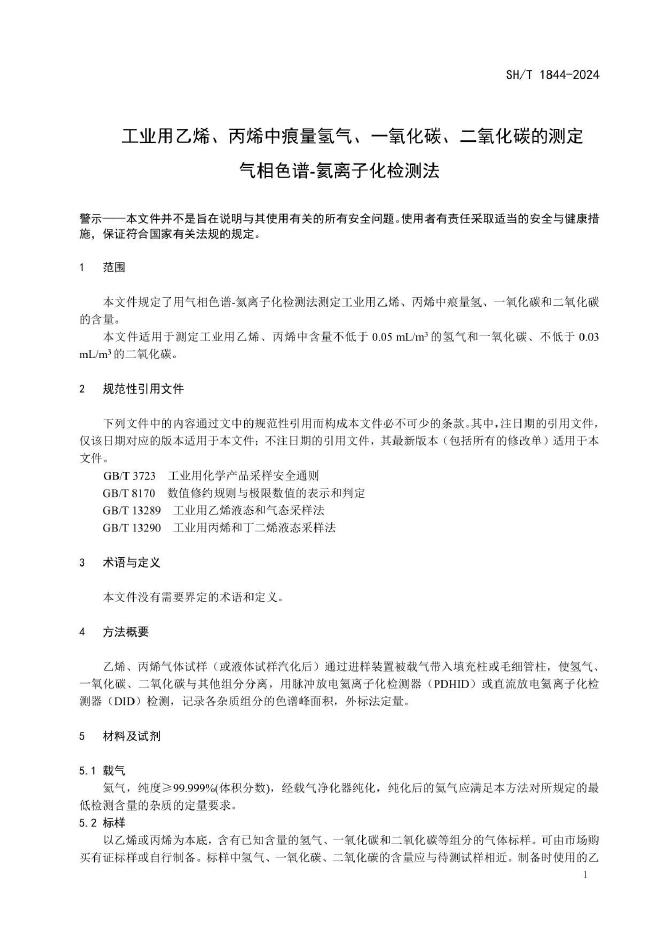 SH/T 1844-2024 工业用乙烯、丙烯中痕量氢气、一氧化碳、二氧化碳的测定 气相色谱-氦离子化检测法