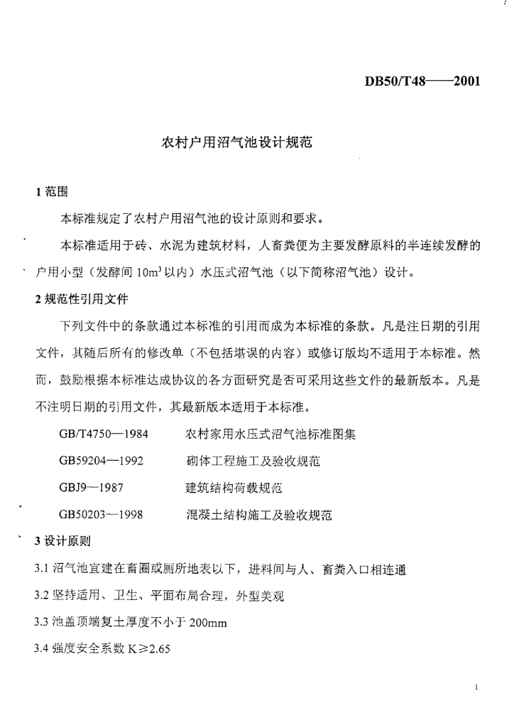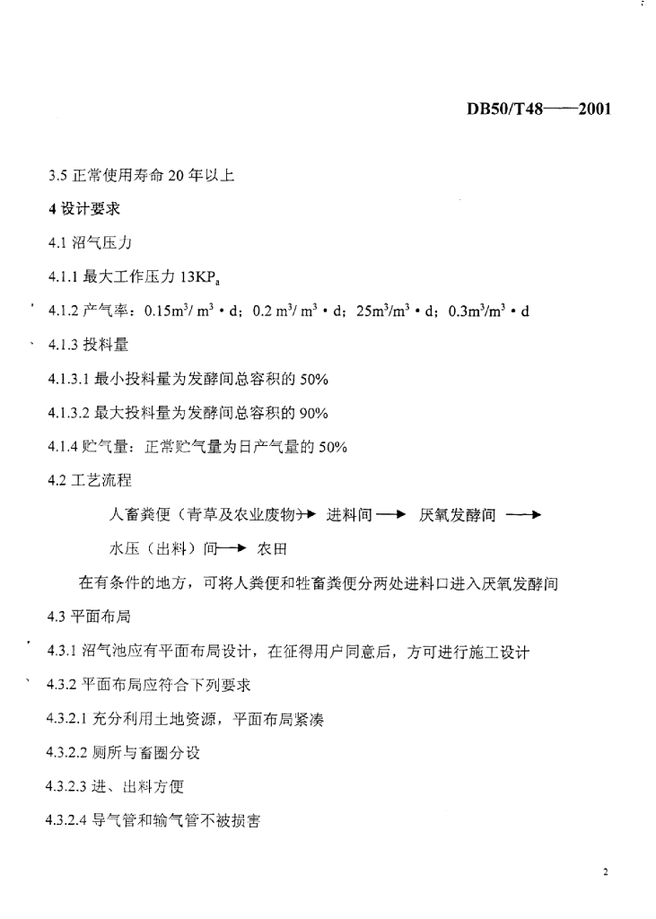 DB50/T 48-2001 农村户用沼气池设计规范