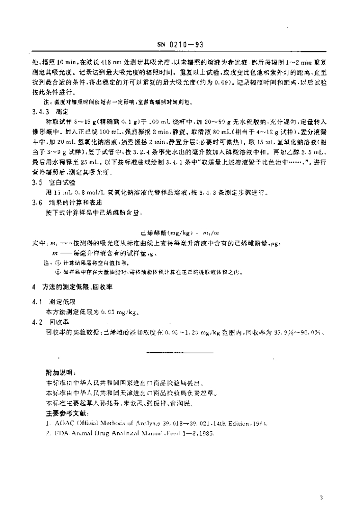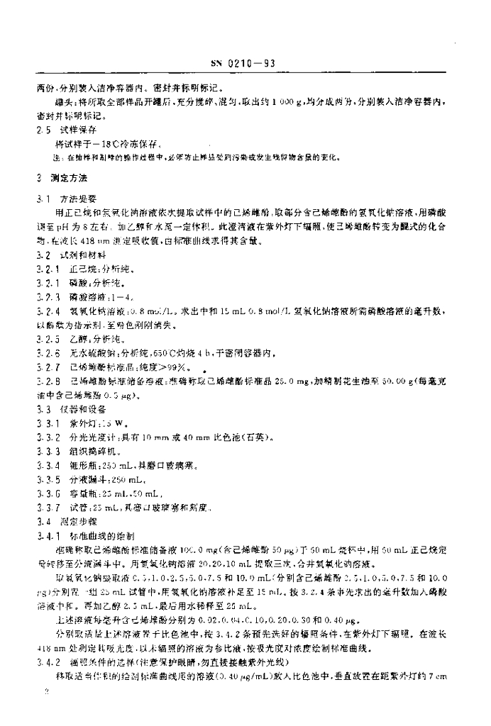 SN 0210-1993 出口肉及肉制品中己烯雌酚残留量检验方法 分光光度法