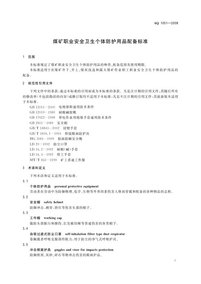 AQ/T 1051-2008 煤矿职业安全卫生个体防护用品配备标准
