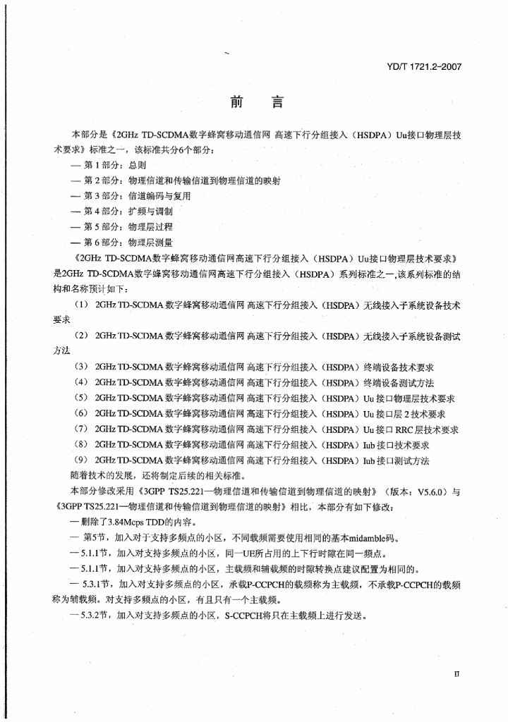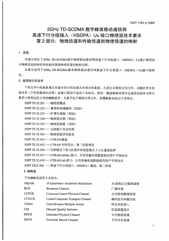 YD/T 1721.2-2007 2GHz TD-SCDMA 数字蜂窝移动通信网高速下行分组接入(HSDPA)Uu 接口物理层技术要求 第2部分:物理信道和传输信道到物理信道的映射