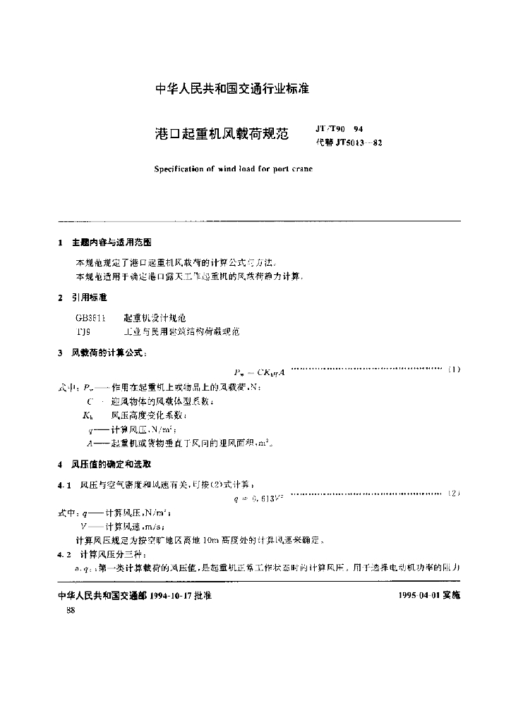 JT/T 90-1994 港口起重机风载荷规范