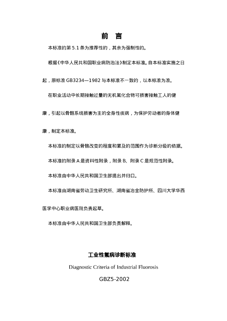 GBZ 5-2002 工业性氟病诊断标准