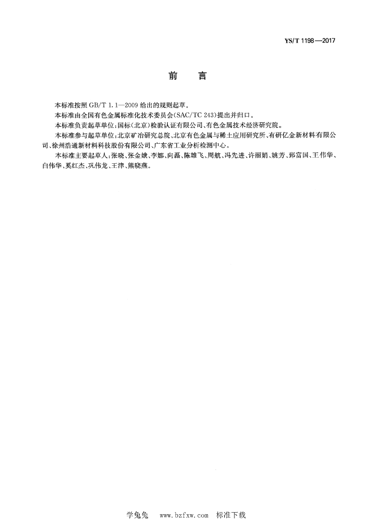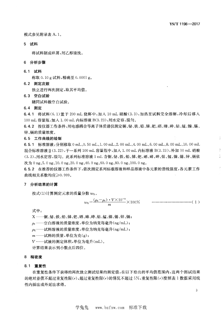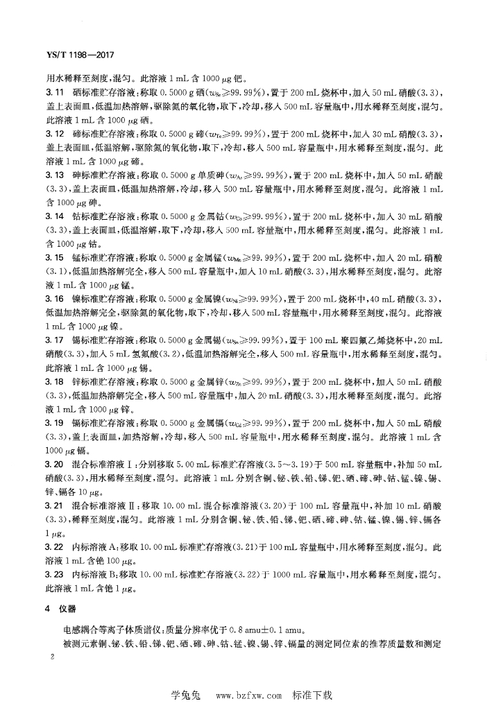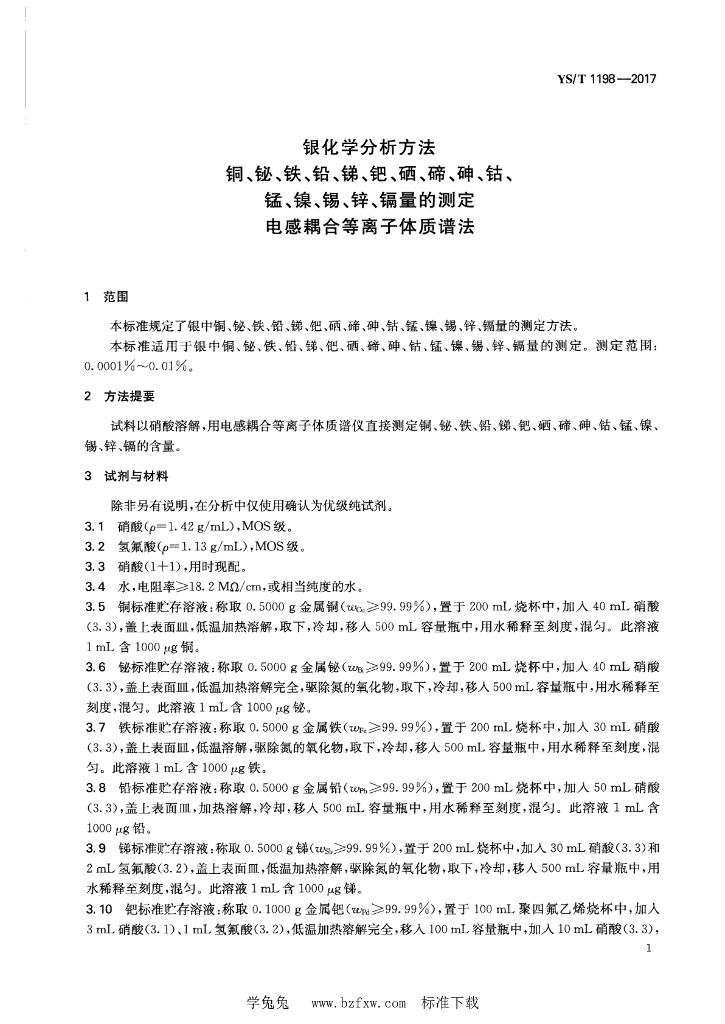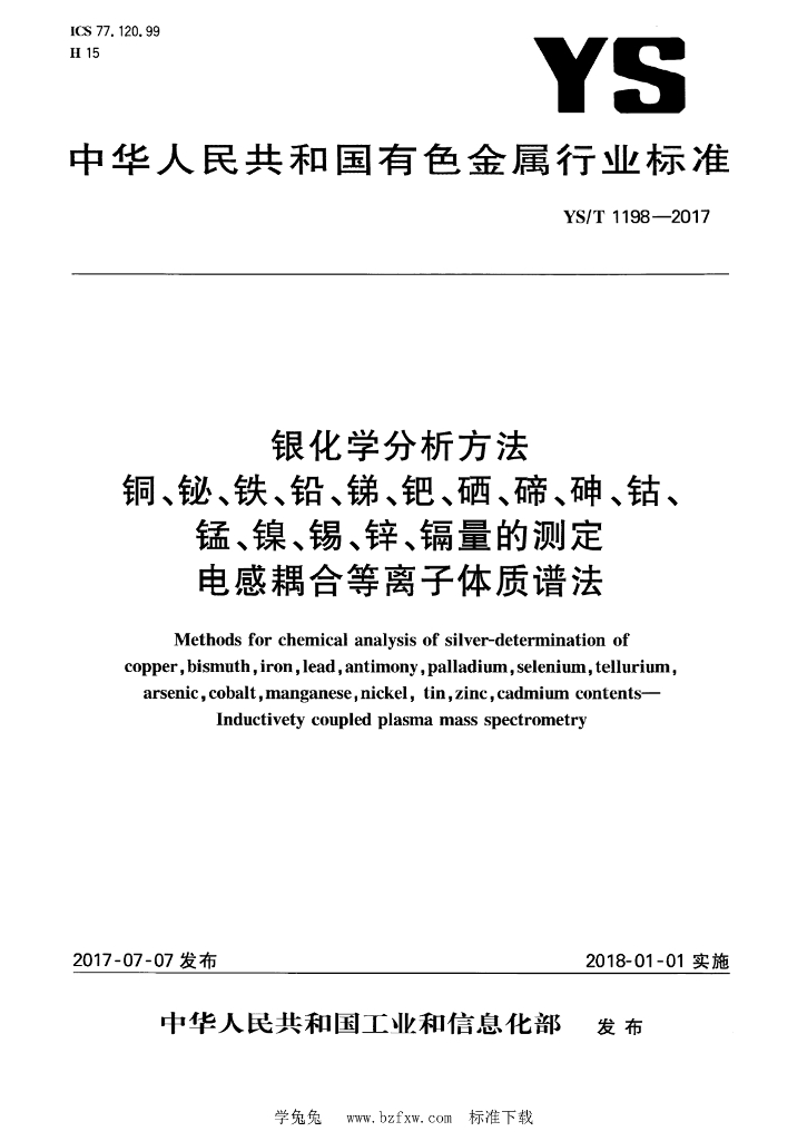 YS/T 1198-2017 银化学分析方法 铜、铋、铁、铅、锑、钯、硒、碲、砷、钴、锰、镍、锡、锌、镉量的测定 电感耦合等离子体质谱法
