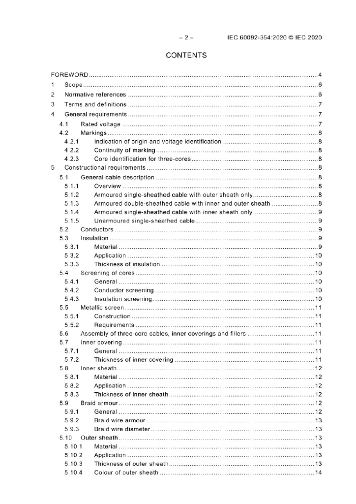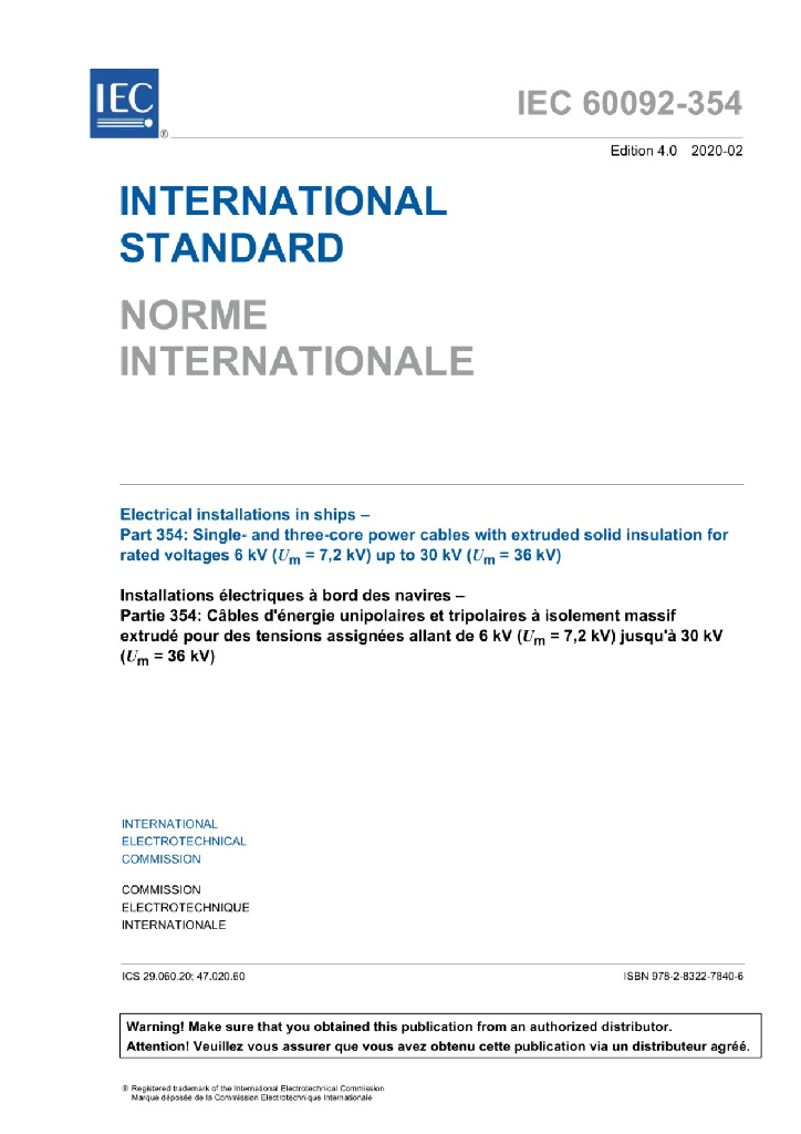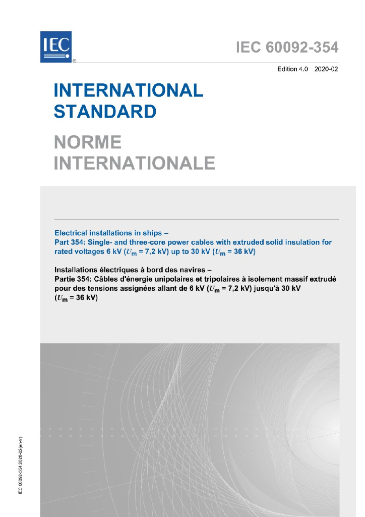 IEC 60092-354:2020 船舶电气设备-第354部分 额定电压6kV(Um = 7.2 kV)至30kV(Um = 36kV)挤包实心绝缘单芯和三芯电力电缆