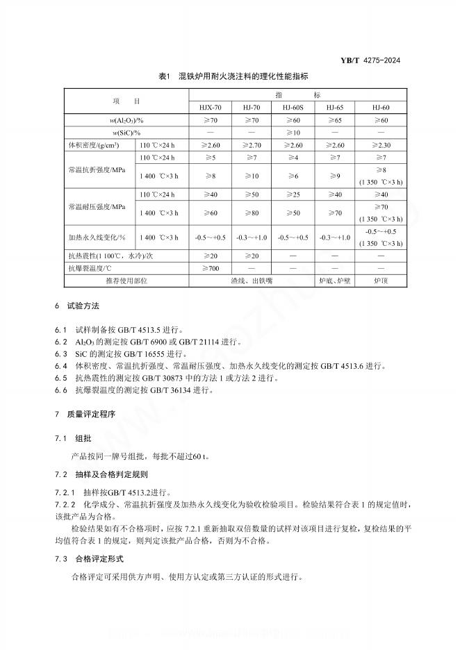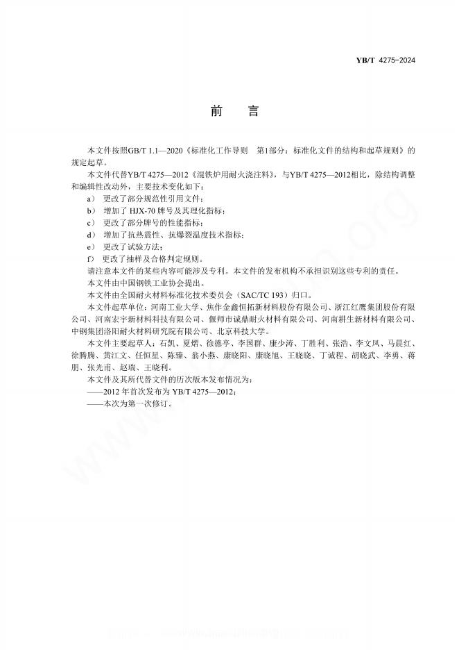 YB/T 4275-2024 混铁炉用耐火浇注料