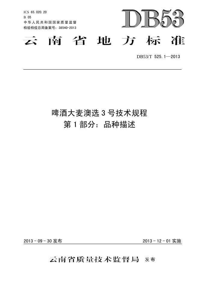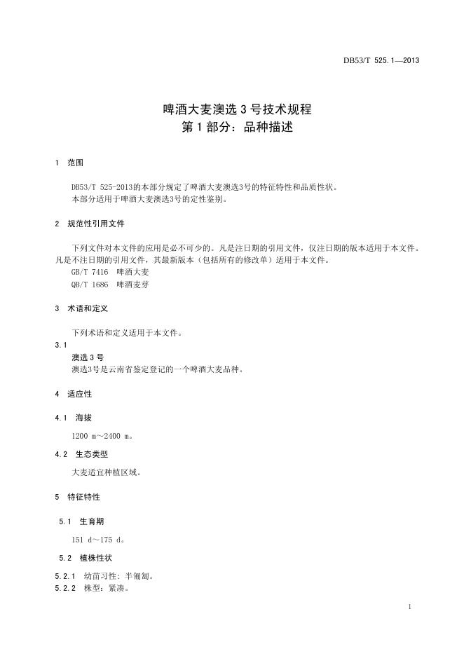 DB53/T 525.1-2013 啤酒大麦澳选3号技术规程 第1部分:品种描述