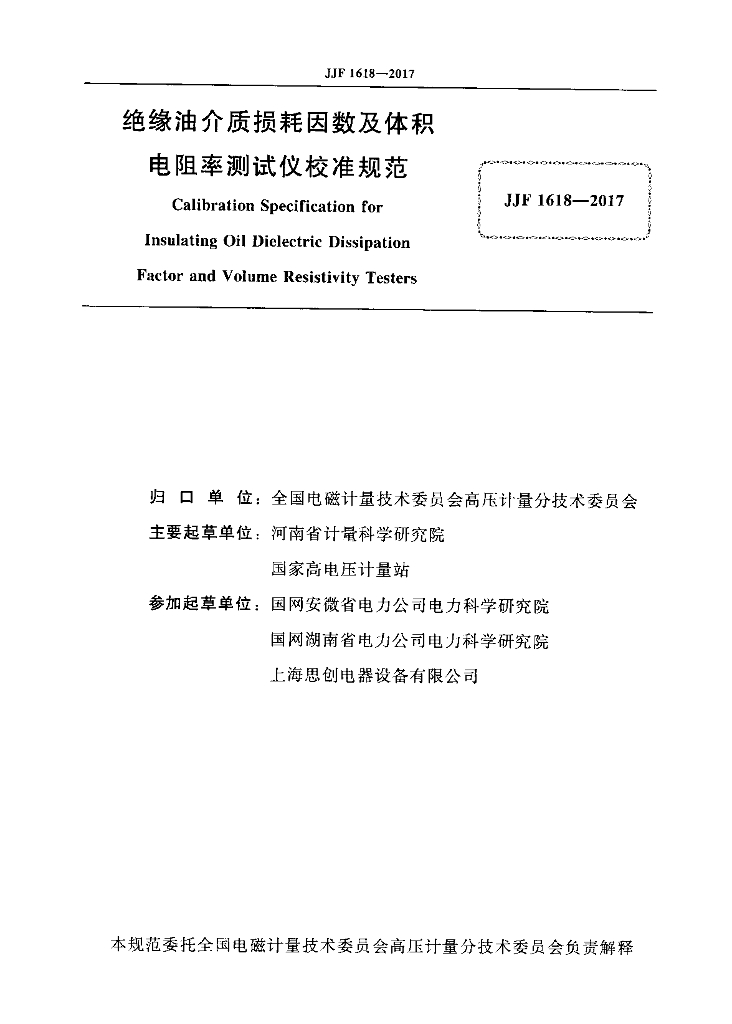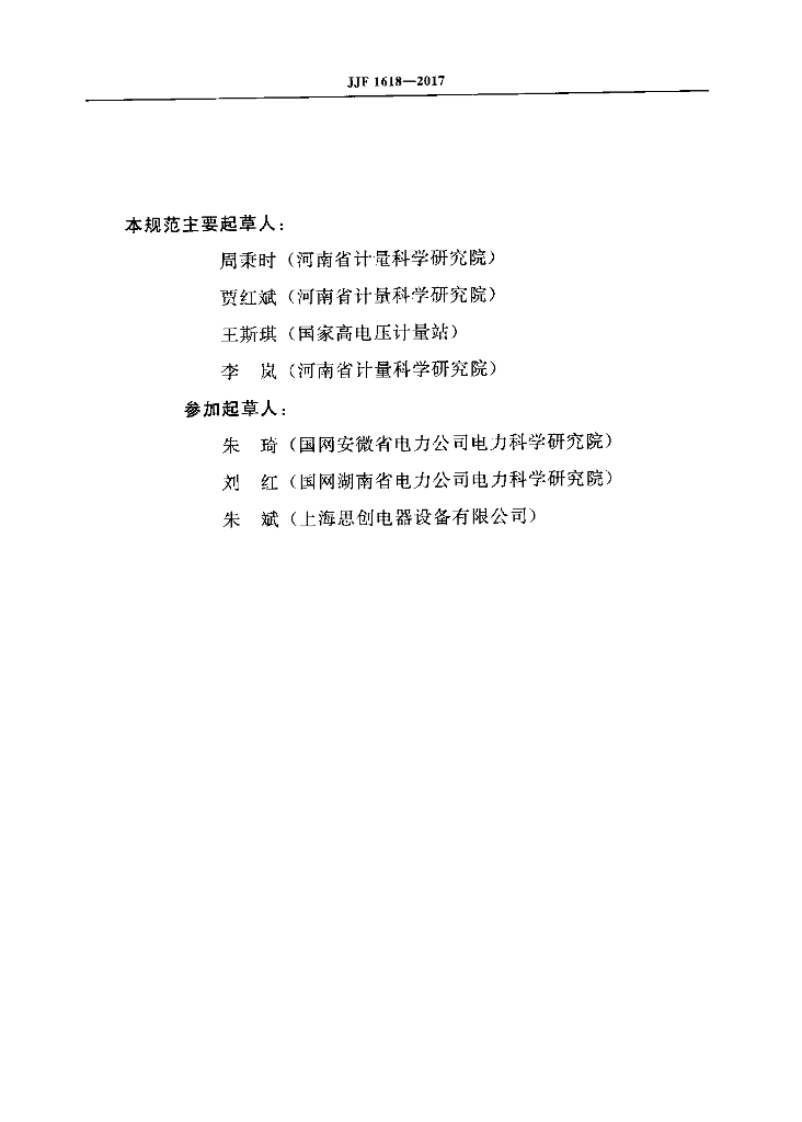 周秉时(河南省计量科学研究院)、贾红斌(河南省计量科学研究院)、王斯琪(国家高压压计量站)、李岚(河南省计量科学研究院)、朱琦(国网安微省电力公司电力科学研究院)、刘红(国网湖南省电力公司电力科学研究院)、朱斌(上海思创电器设备有限公司)