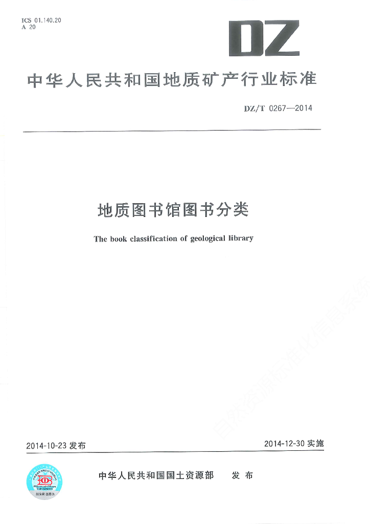 DZ/T 0267-2014 地质图书馆图书分类