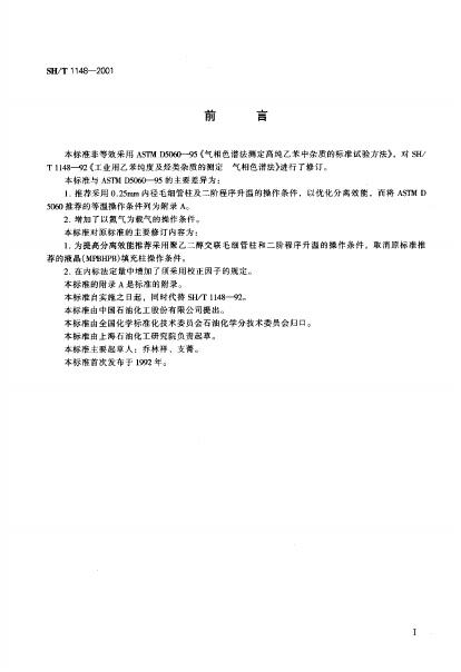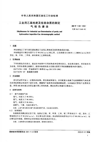 SH/T 1148-1992 工业用乙苯纯度及烃类杂质的测定 气相色谱法