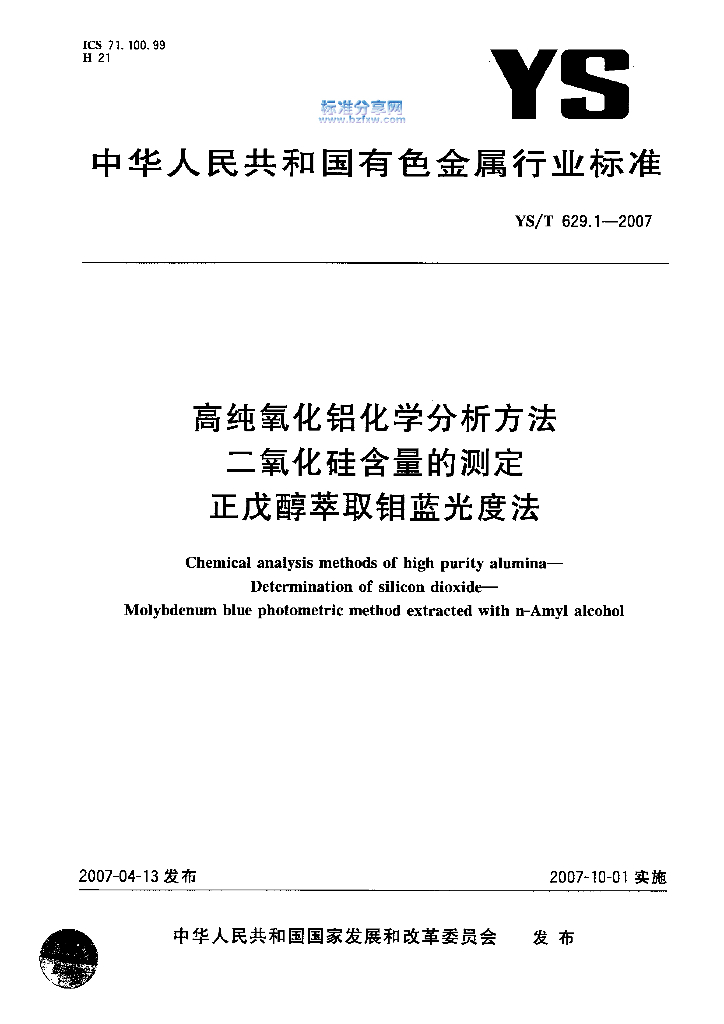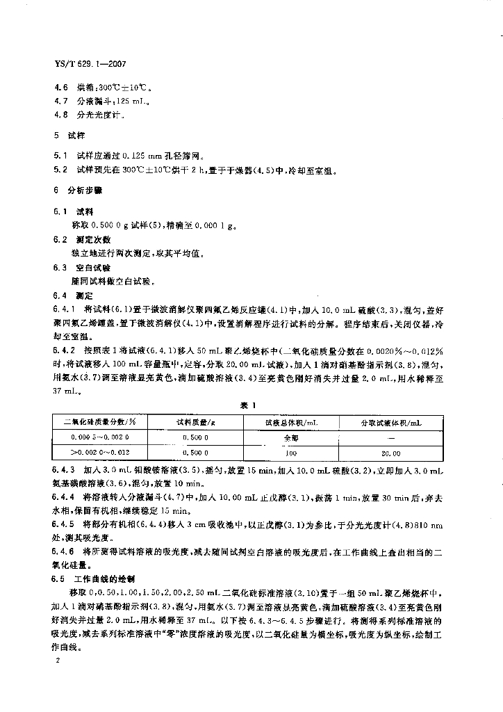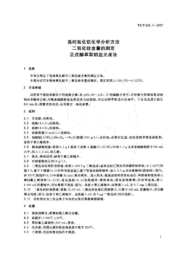 YS/T 629.1-2007 高纯氧化铝化学分析方法 二氧化硅含量的测定 正戊醇萃取钼蓝光度法