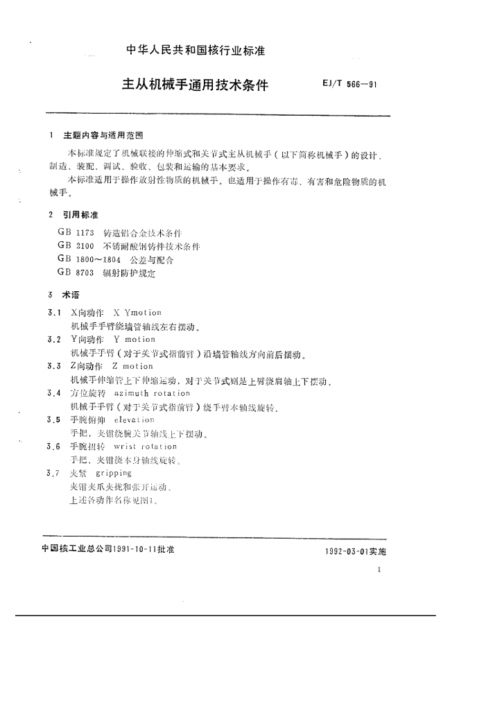 EJ/T 566-1991 主从机械手通用技术条件
