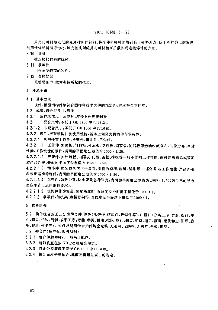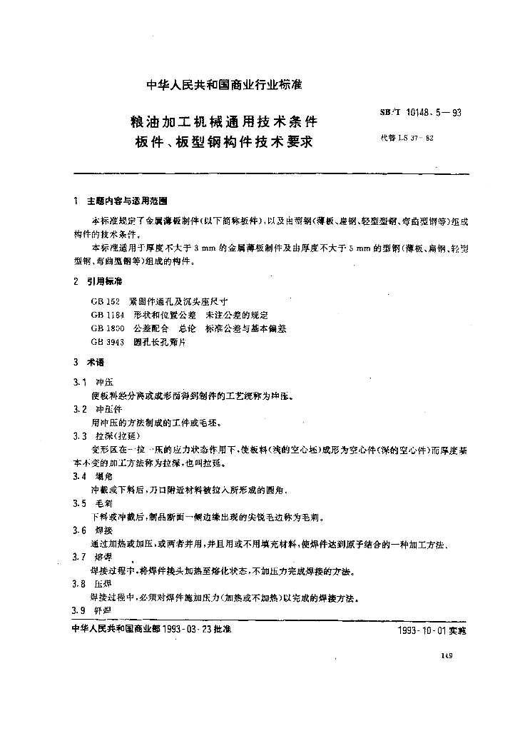 SB/T 10148.5-1993 粮油加工机械通用技术条件 板件、板型钢构件技术要求(LS/T 3501.5-1993)
