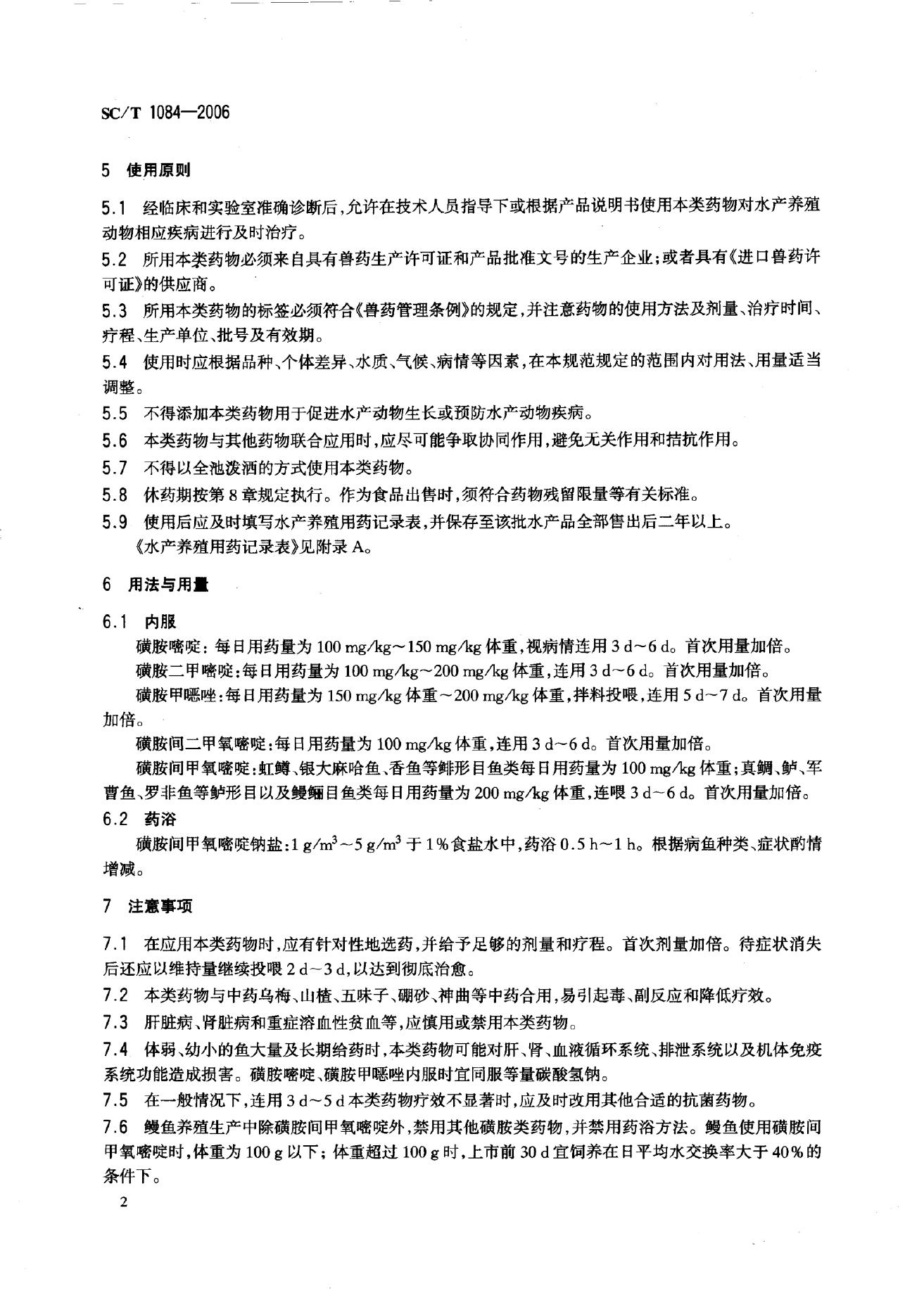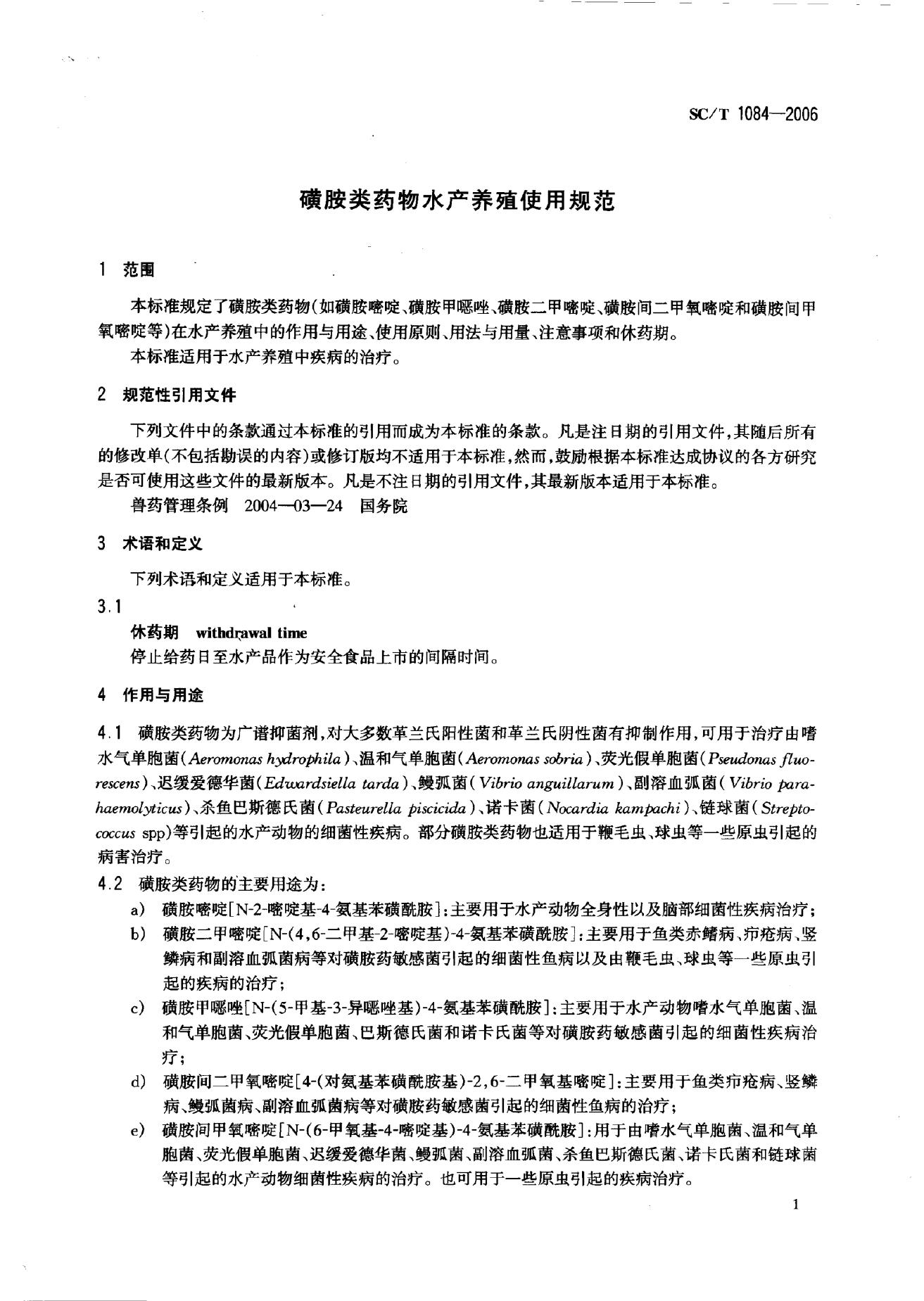 SC/T 1084-2006 磺胺类药物水产养殖使用规范