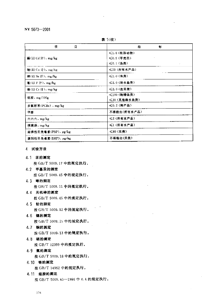 NY 5073-2001 无公害食品 水产品中有毒有害物质限量
