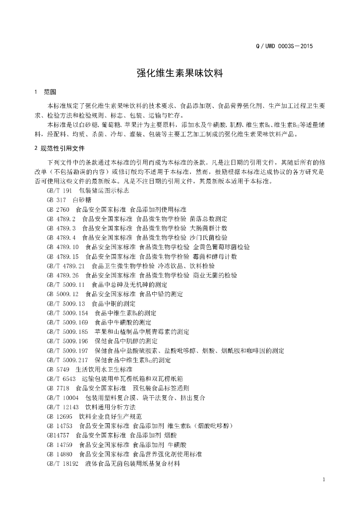 Q/UWD 0003S-2015 山东优味多食品有限公司 强化维生素果味饮料