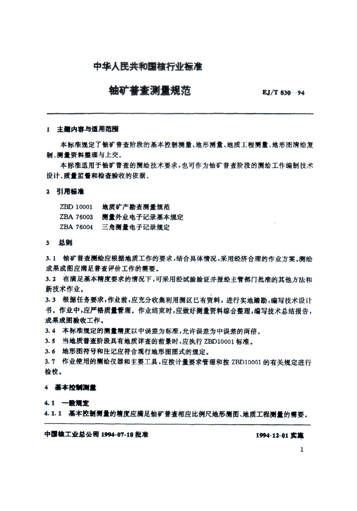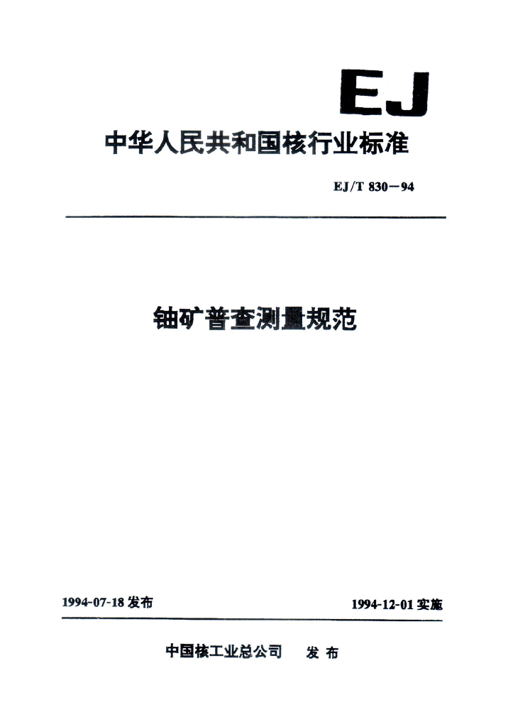 EJ/T 830-1994 铀矿普查测量规范