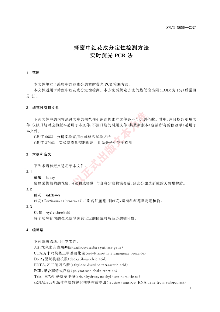 SN/T 5650-2024 蜂蜜中红花成分定性检测方法 实时荧光PCR法