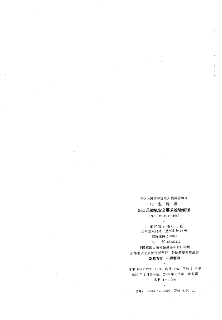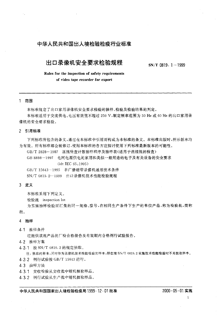 SN/T 0819.1-1999 出口录像机安全要求检验规程
