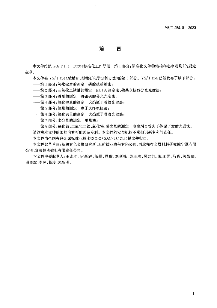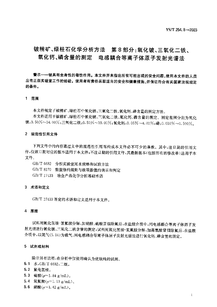 YS/T 254.8-2023 铍精矿、绿柱石化学分析方法 第8部分:氧化铍、三氧化二铁、氧化钙、磷含量的测定 电感耦合等离子体原子发射光谱法