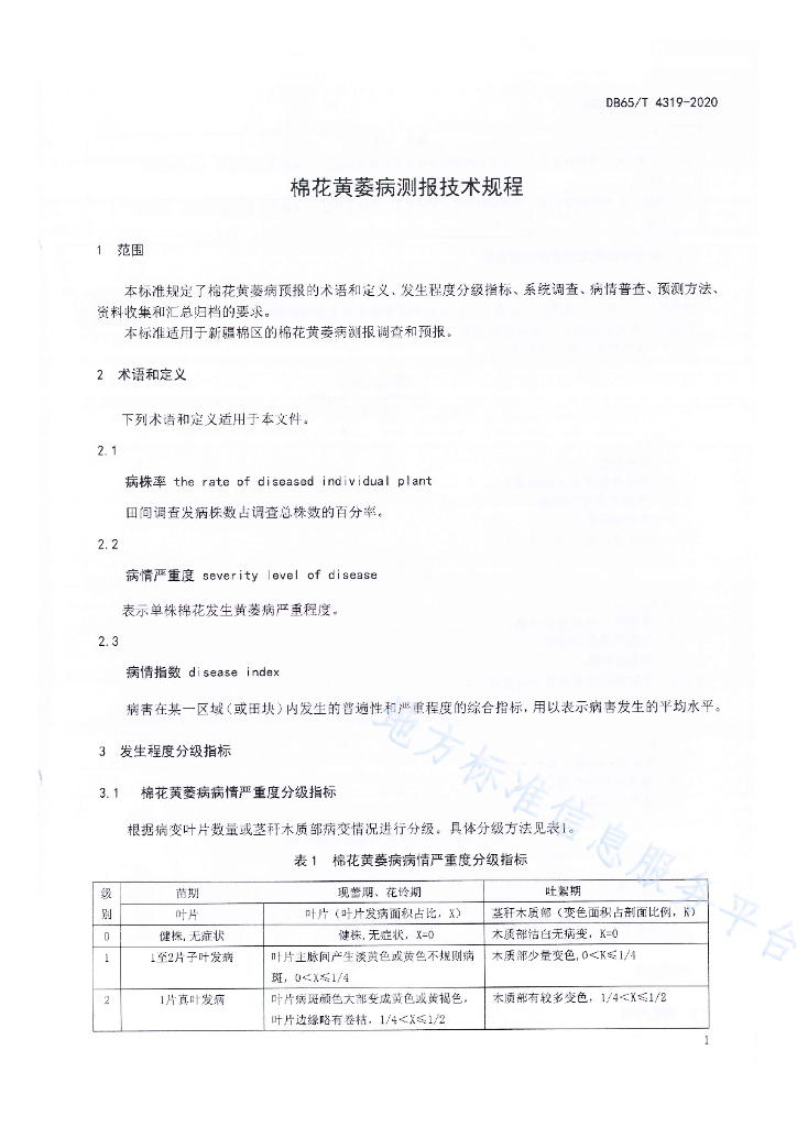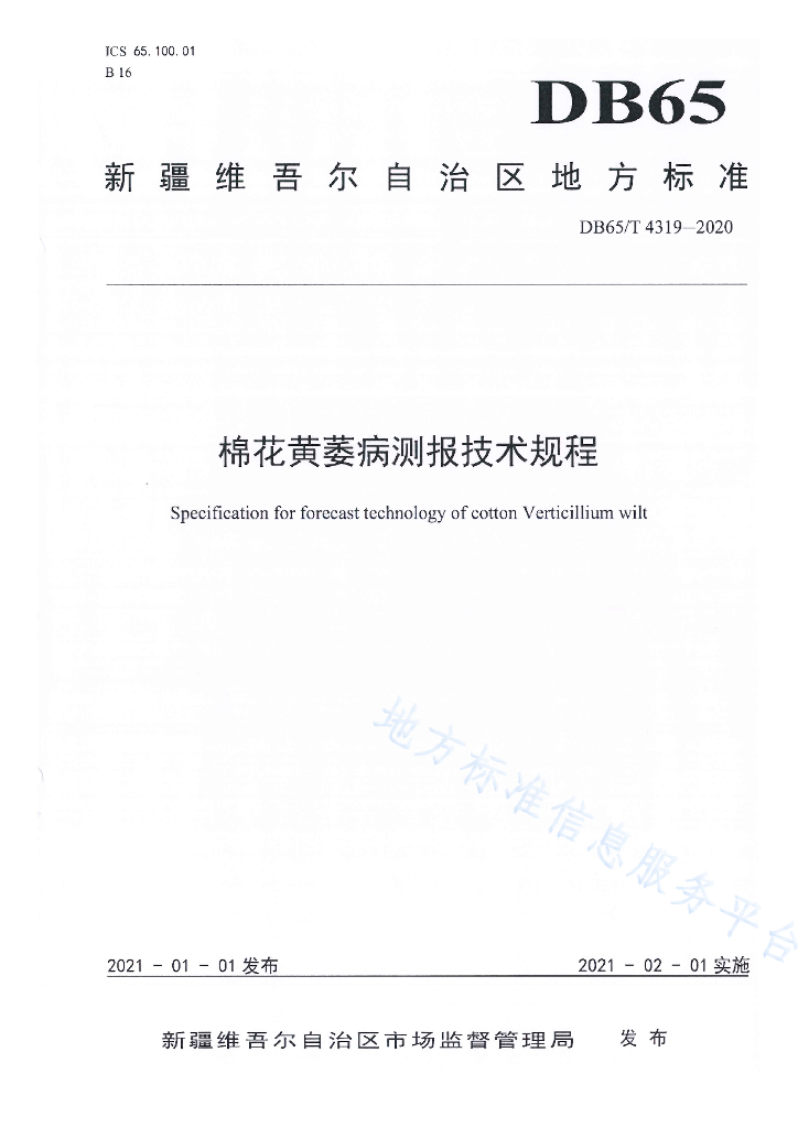 DB65/T 4319-2020 棉花黄萎病测报技术规程