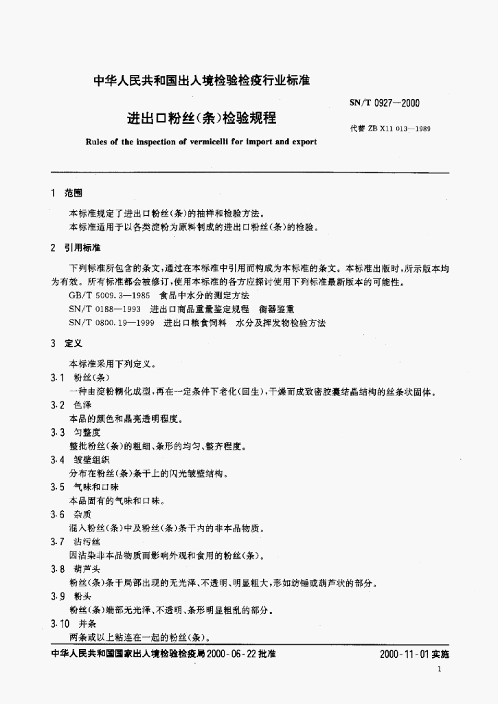 SN/T 0927-2000 进出口粉丝(条)检验规程