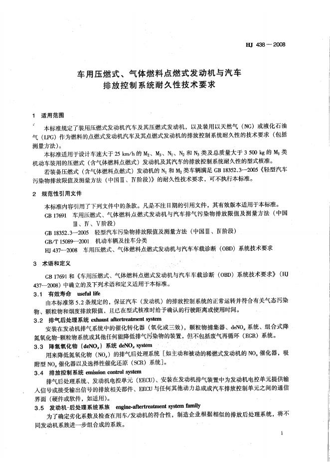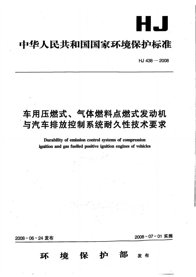 HJ 438-2008 车用压燃式、气体燃料点燃式发动机与汽车排放控制系统耐久性技术要求