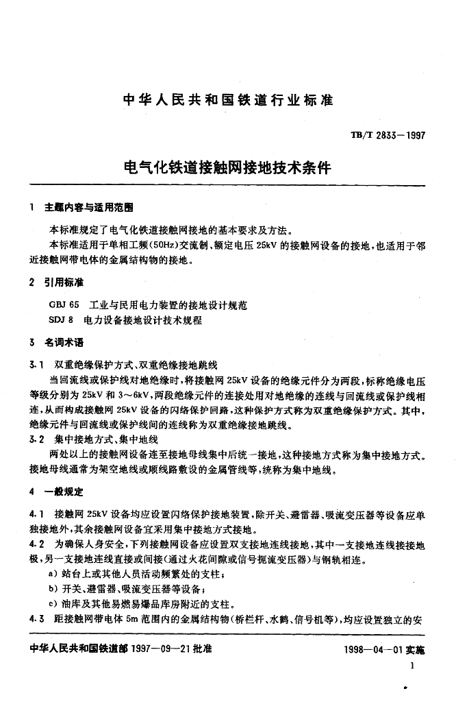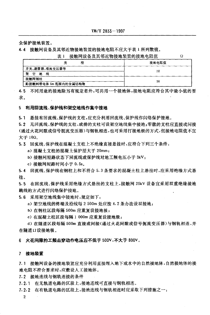 TB/T 2833-1997 电气化铁道接触网接地技术条件