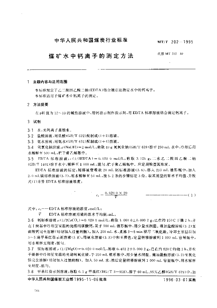 MT/T 202-1995 煤矿水中钙离子的测定方