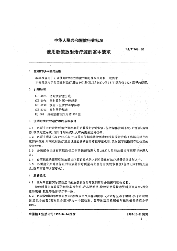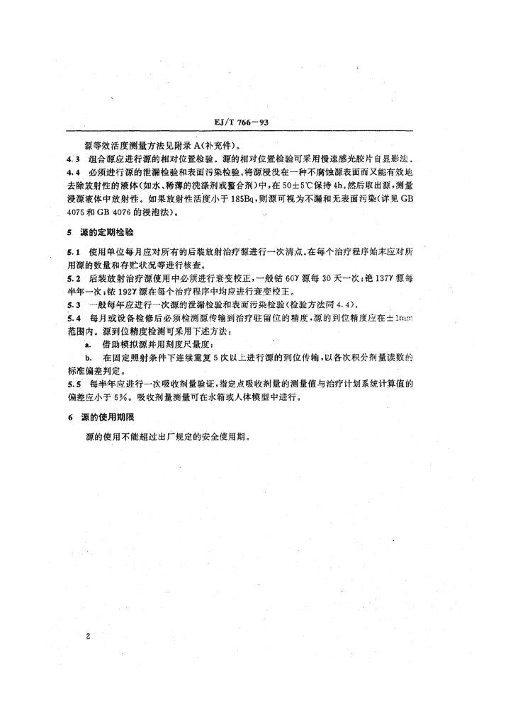 EJ/T 766-1993 使用后装放射治疗源的基本要求
