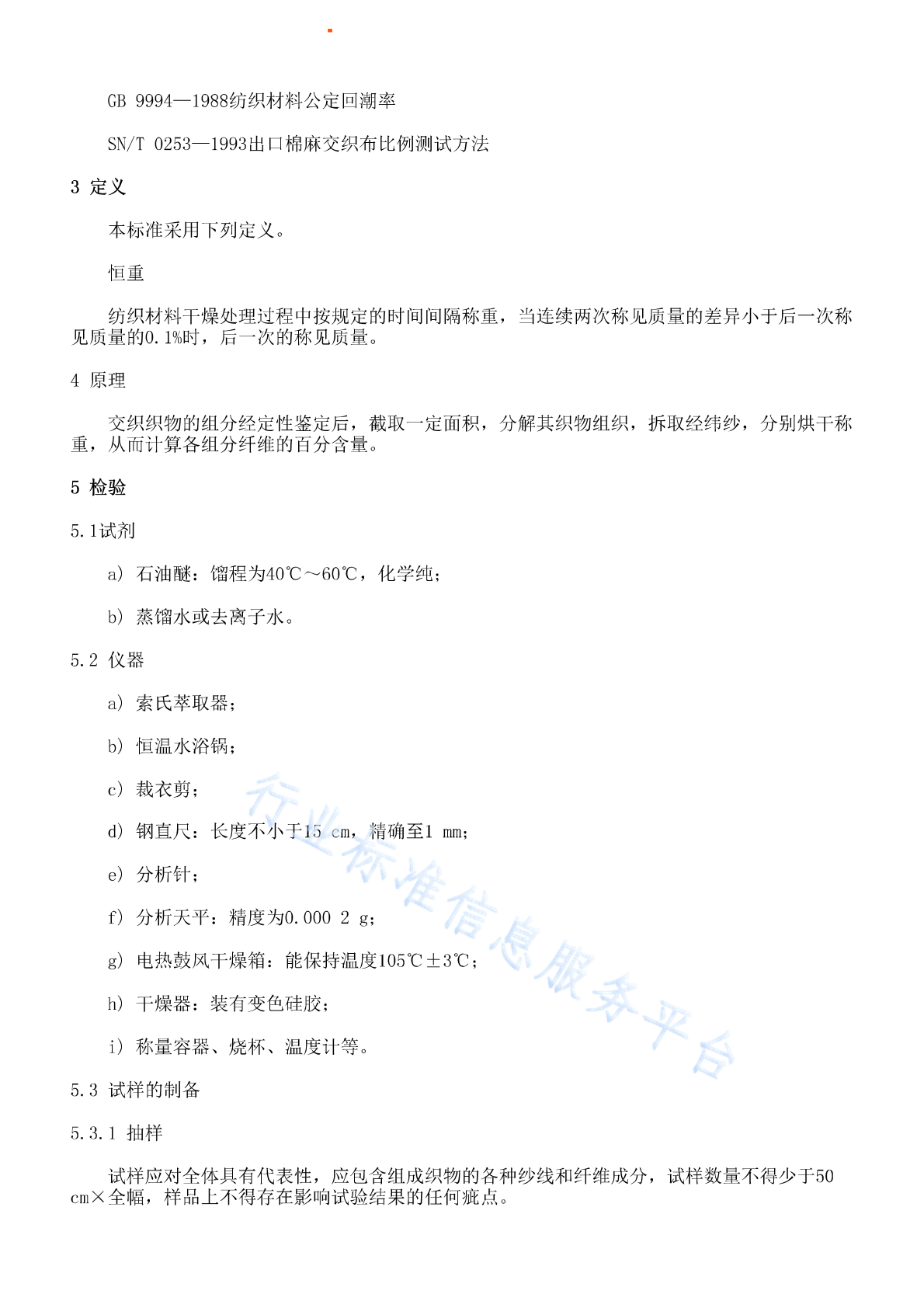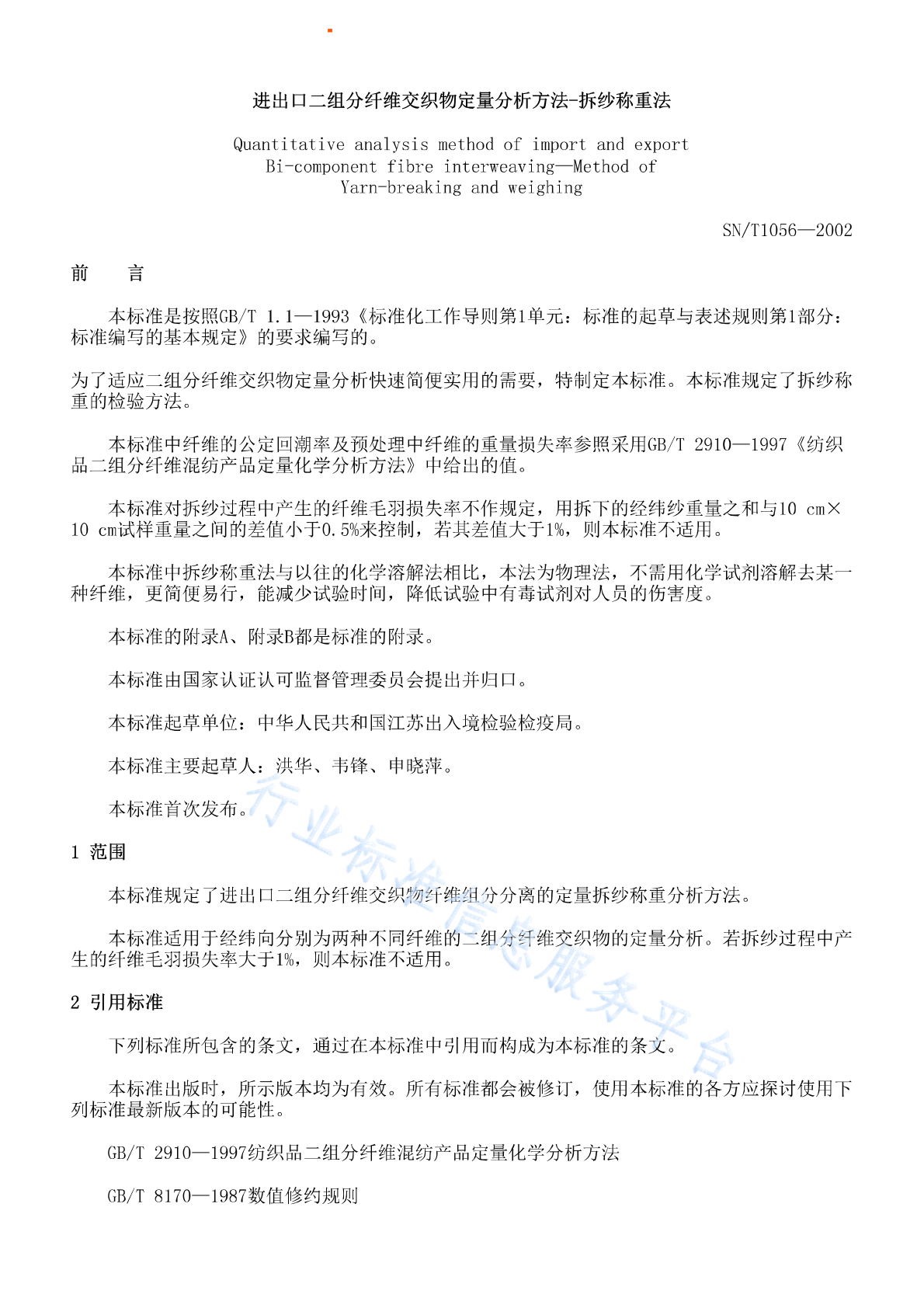 SN/T 1056-2002 进出口二组份纤维交织物定量分析方法 拆纱称重法
