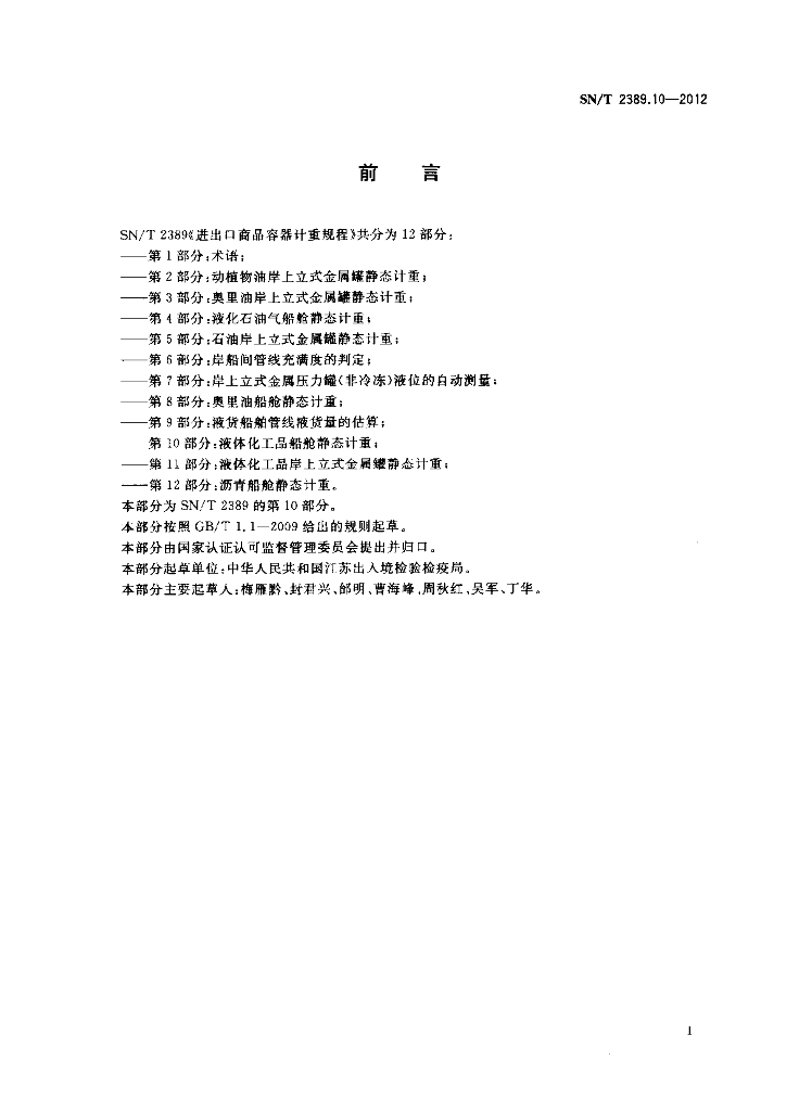 SN/T 2389.10-2012 进出口商品容器计重规程 第10部分:液体化工品船舱静态计重