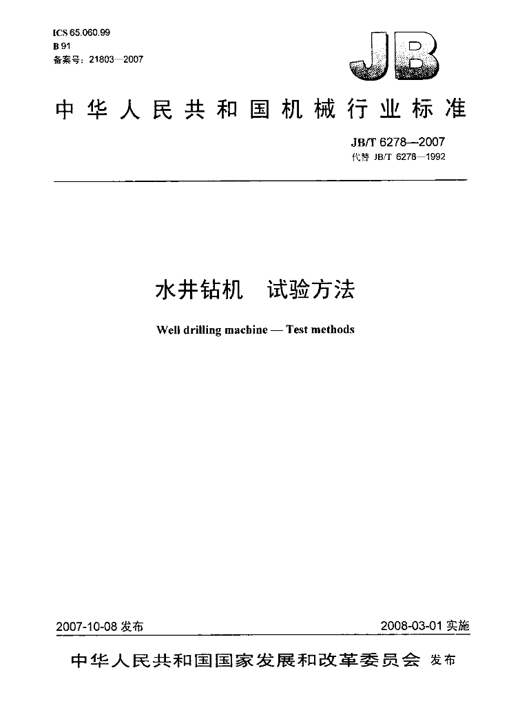 JB/T 6278-2007 水井钻机 试验方法