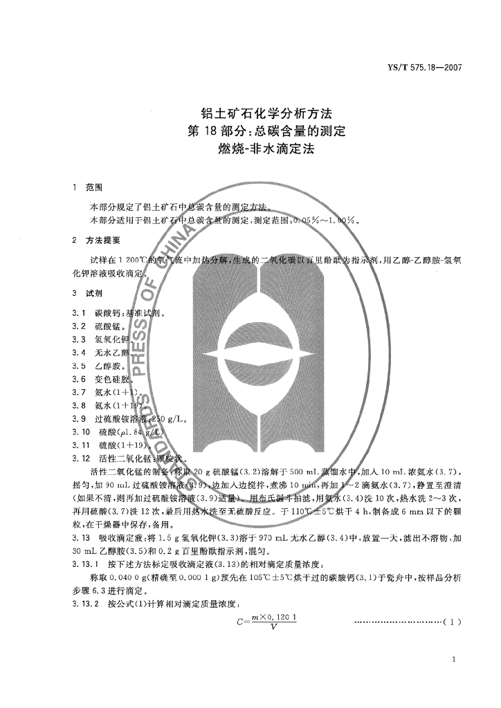 YS/T 575.18-2007 铝土矿石化学分析方法 第18部分:总碳含量的测定 燃烧-非水滴定法