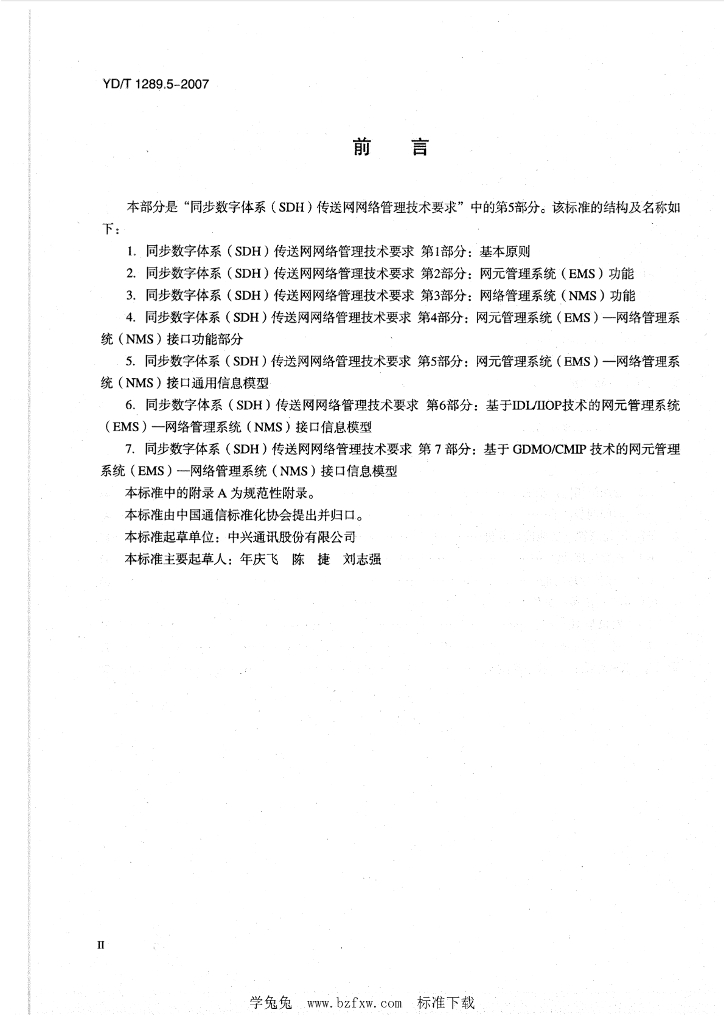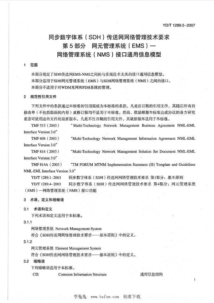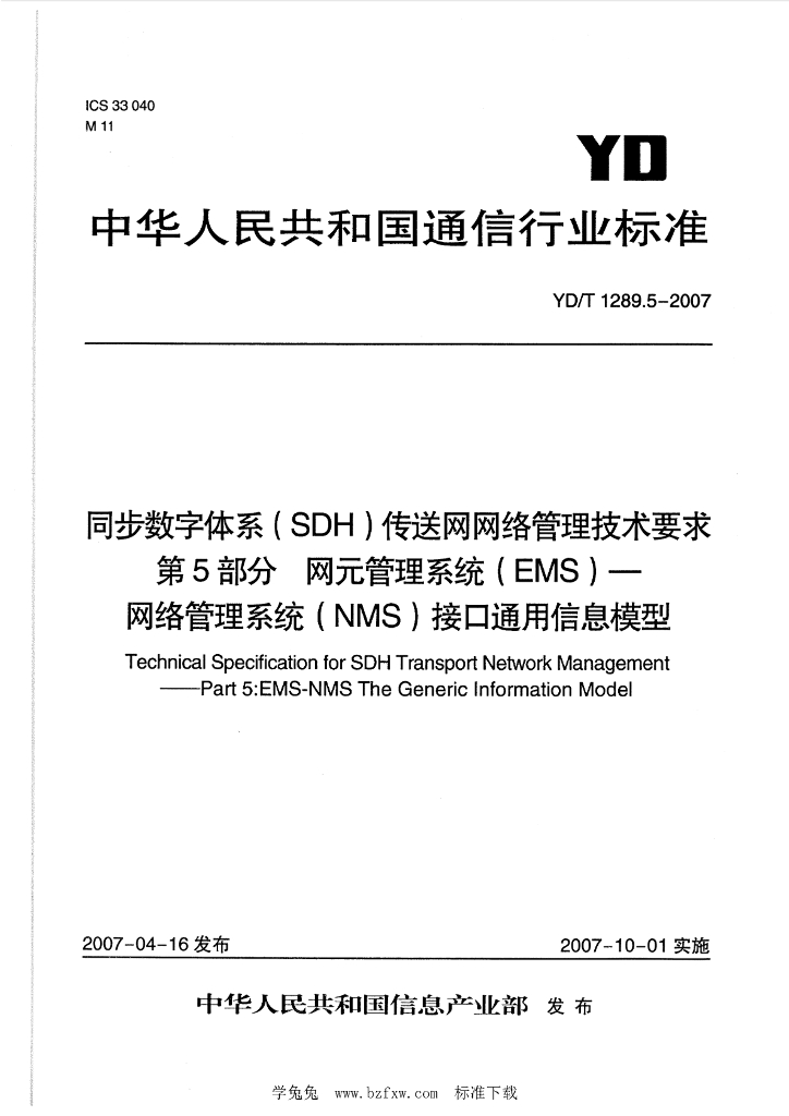 YD/T 1289.5-2007 同步数字体系(SDH)传送网网络管理技术要求 第5部分:网元管理系统(EMS)-网络管理系统(NMS)接口通用信息模型
