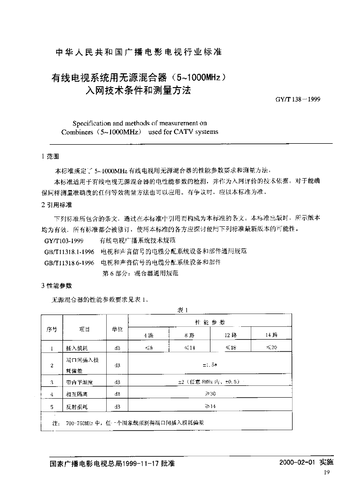 GY/T 138-1999 有线电视系统用无源混合器(5~ 1000MHz)入网技术条件和测量方法