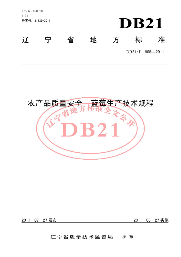 DB21/T 1905-2011 农产品质量安全 蓝莓生产技术规程