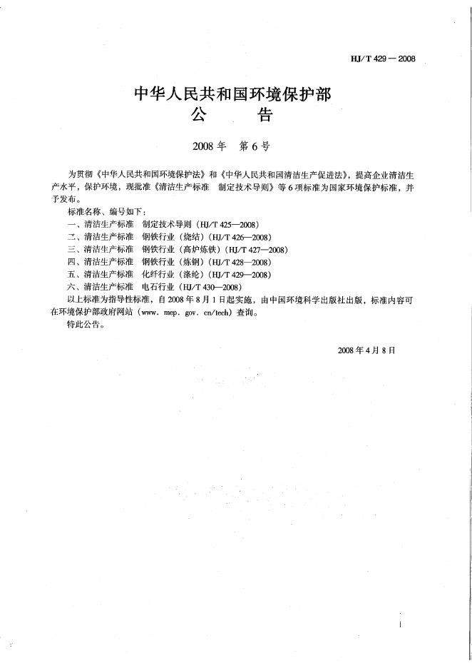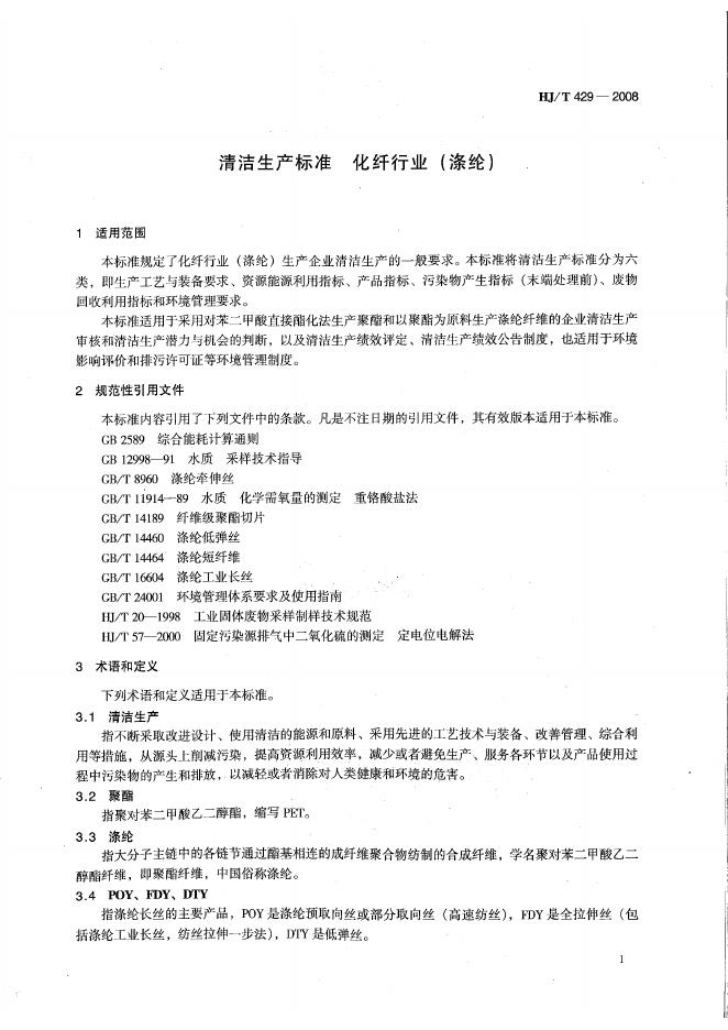 HJ/T 429-2008 清洁生产标准 化纤行业(涤纶)