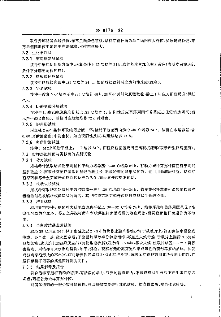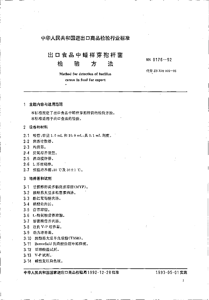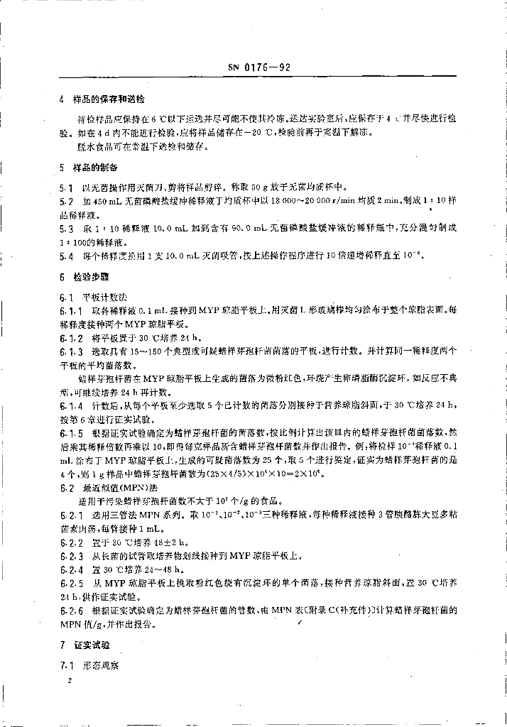 SN 0176-1992 出口食品中蜡样芽孢杆菌检验方法