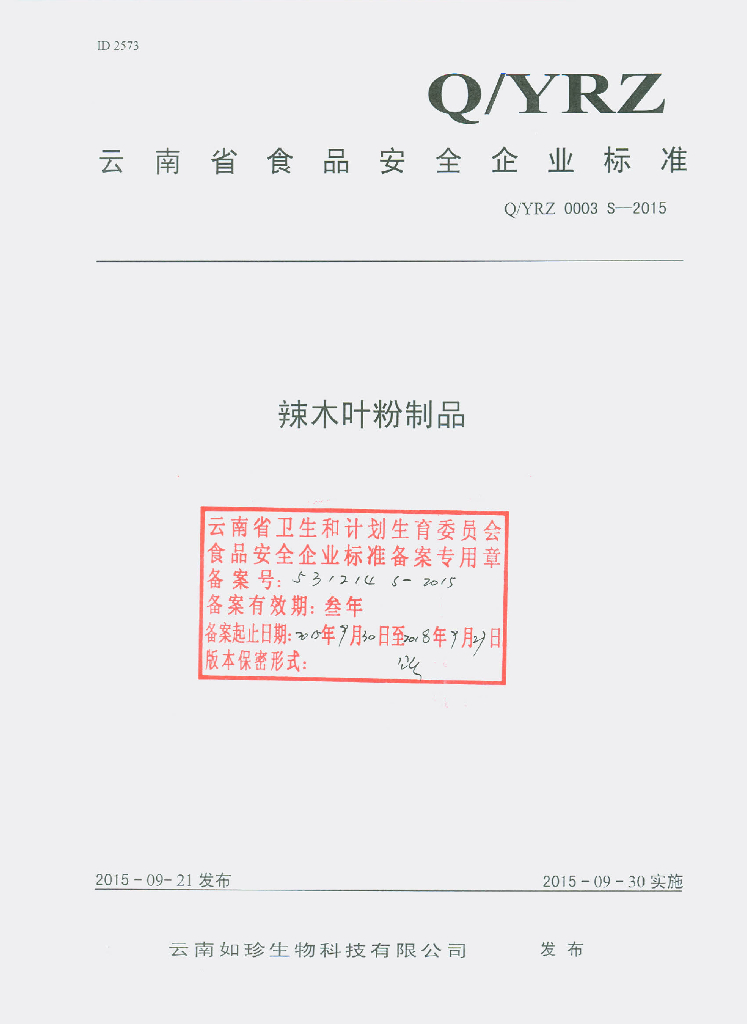 Q/YRZ 0003S-2015 云南如珍生物科技有限公司 辣木叶制品